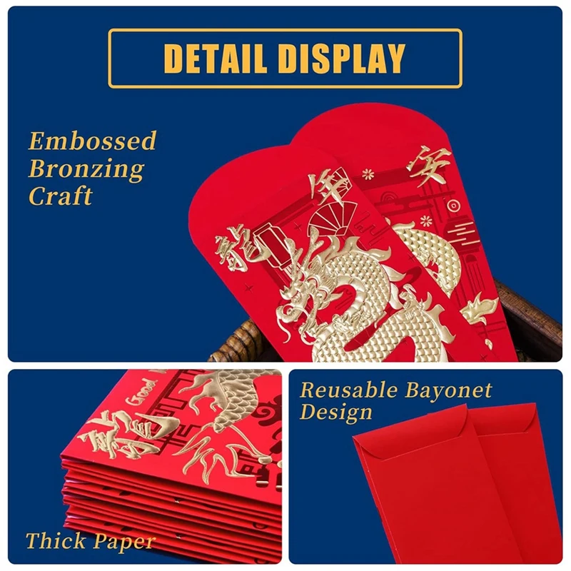 6 diseños: Los Sobres Rojos del Año Nuevo Chino están estampados con Dragones en 6 formas diferentes y caracteres chinos. La lámina dorada es muy brillante y el relieve es encantador y delicado.