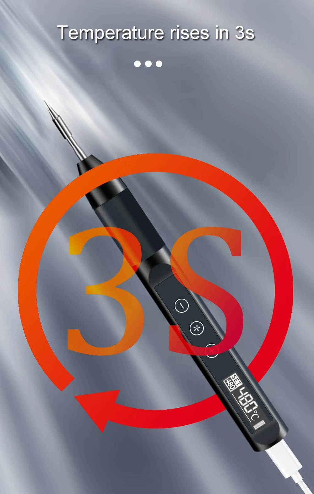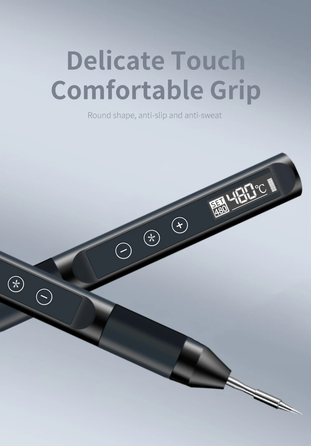 1.Encendido/apagado: Después de conectar la fuente de carga rápida, la pantalla OLED mostrará "Esperando una carga rápida".Una vez que se detecta el protocolo de carga rápida, la pantalla se apagará (pantalla APAGADA).Presione el botón de encendido para activar la función de calefacción.En el lado izquierdo de la pantalla OLED, un pequeño cuadrado mostrará la temperatura establecida.En el medio, se mostrará la temperatura real del cabezal del soldador.La barra de potencia en el lado derecho de la pantalla indicará el nivel de potencia en tiempo real, con una barra más larga que indica mayor potencia.Una vez que la temperatura alcance la temperatura establecida, el soldador mantendrá una temperatura constante.Para ingresar al modo de espera y dejar de calentar, mantenga presionado el botón de encendido mientras el soldador está encendido.La pantalla OLED se apagará, indicando que la plancha está en modo de espera.