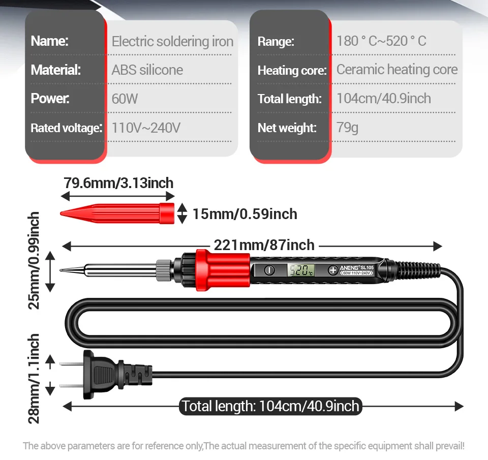 Soldador eléctrico de 60W ANENG SL105, pantalla Digital LCD, temperatura ajustable, electricista, herramientas de puntas de soldadura de calentamiento rápidoLas opciones SL104 y SL105 representan respectivamente diferentes modelos. El rango de temperatura del SL104 es: 200°C-450°C;sin pantalla digital El rango de temperatura del SL105 es: 180°C-520°C;con pantalla digital