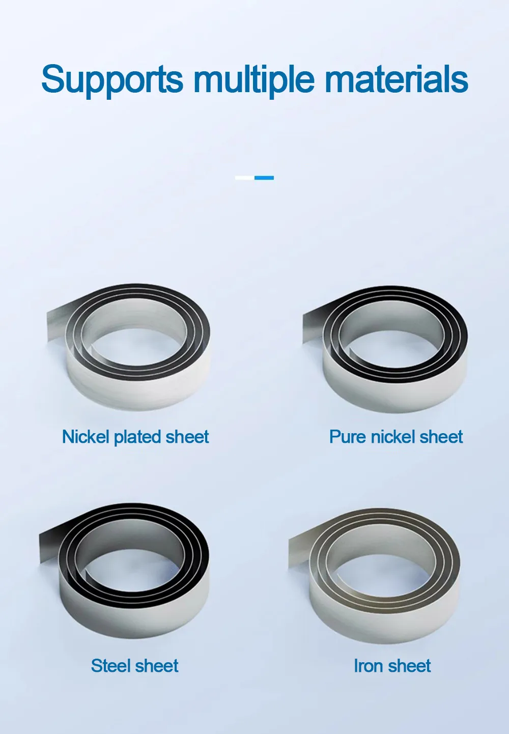La tira de níquel se espesa: 0,1, 0,15, 0,2, 0,3 mm (el aluminio/oro/plata no se puede cerrar fácilmente).