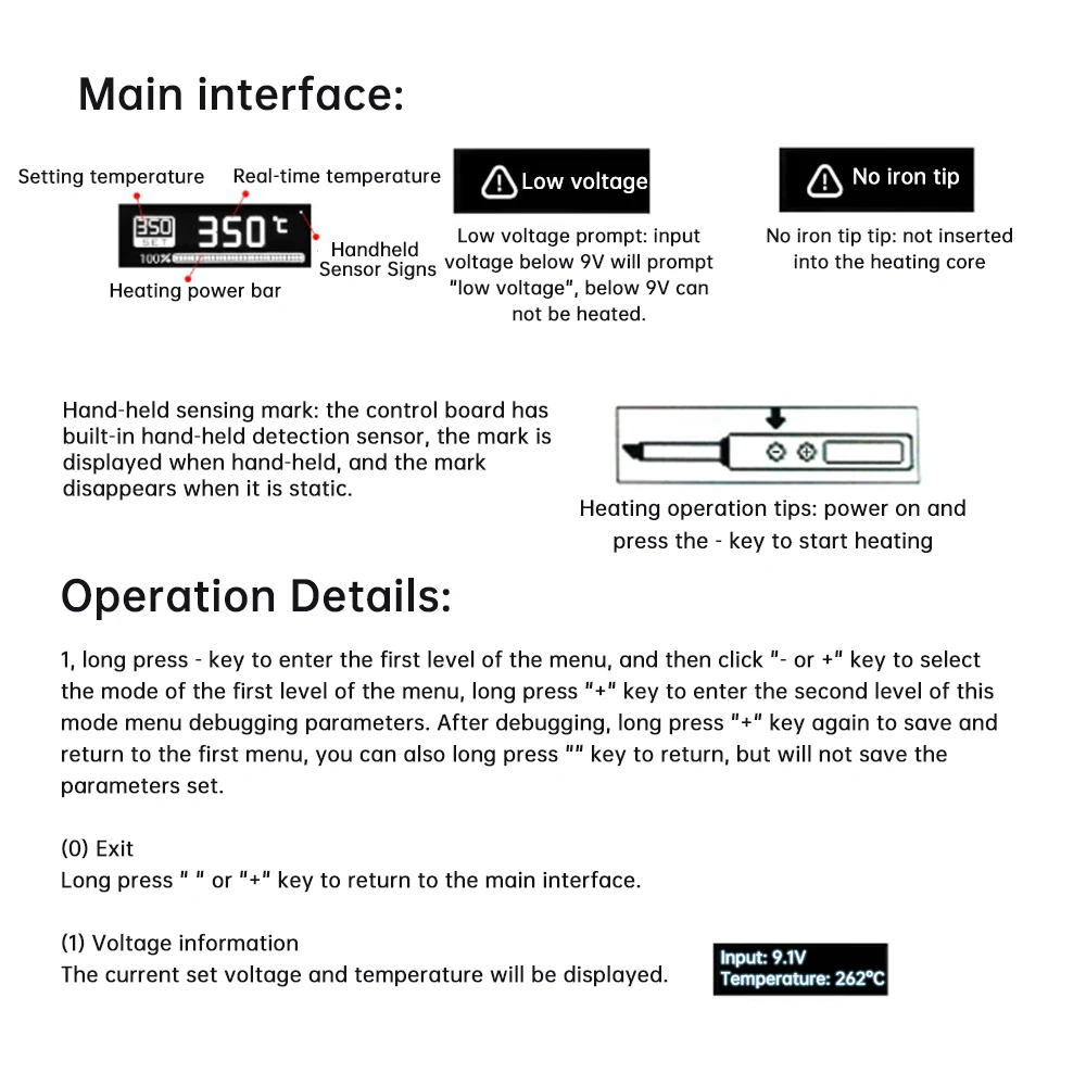 6. Puede establecer la temperatura de hibernación, el tiempo de espera, el voltaje de trabajo y otros parámetros, admite el idioma chino e inglés, se puede convertir entre Celsius (80 ~ 450 ℃) y Fahrenheit (176 ~ 842 ℉) y otros ajustes, para satisfacer las necesidades individuales