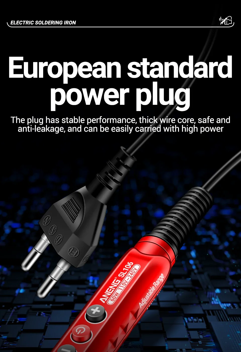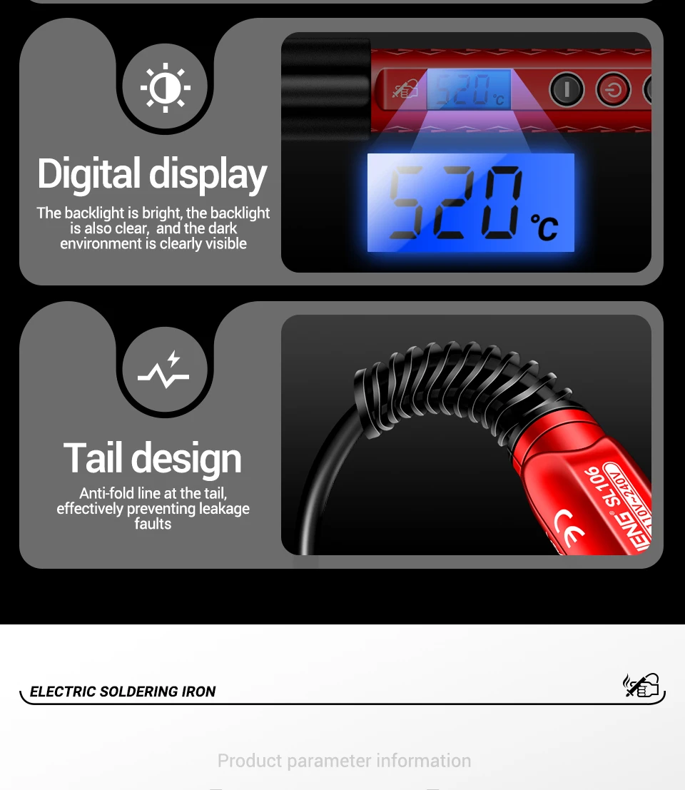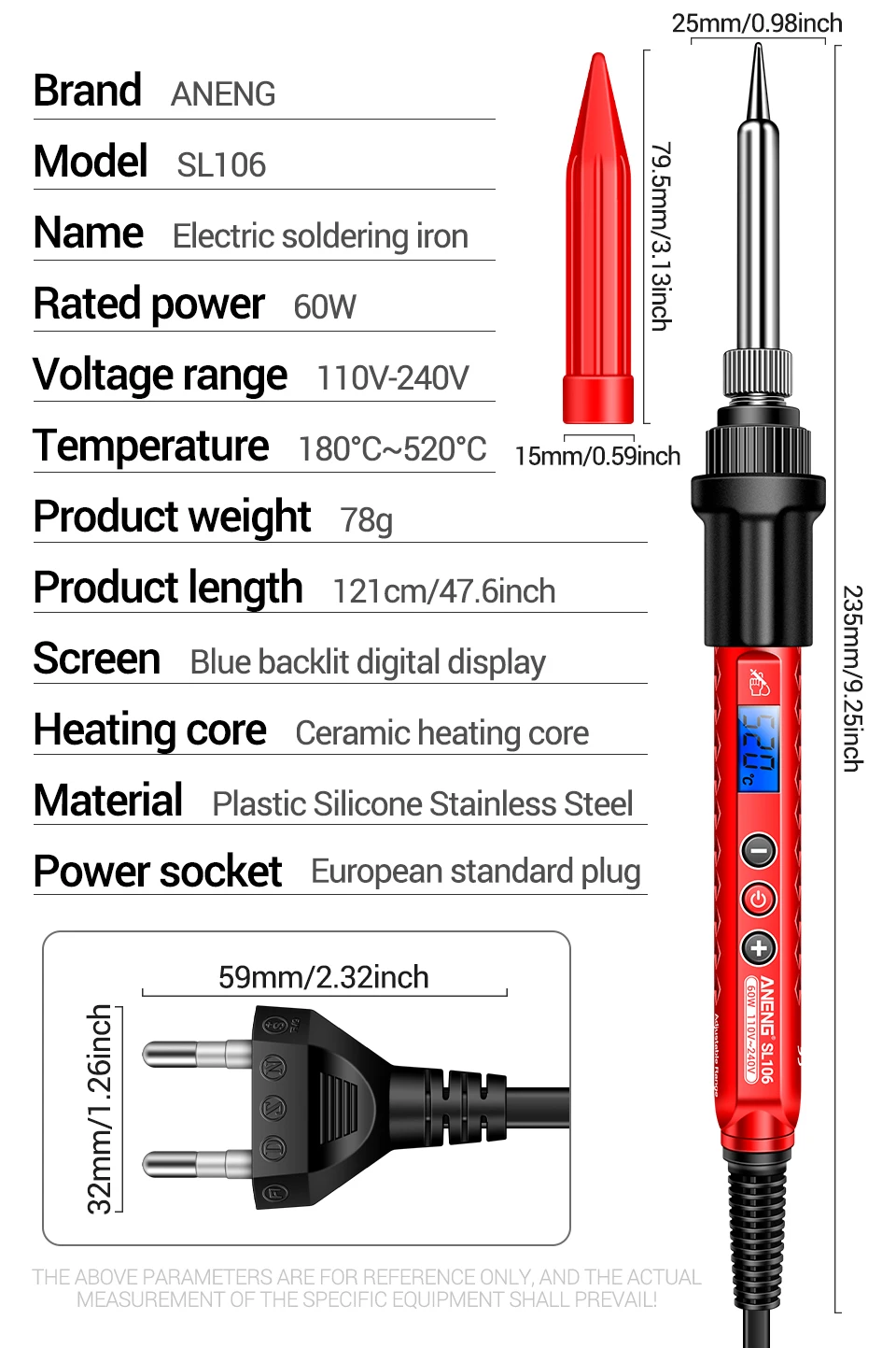 Especificaciones: Modelo: SL106 Nombre: Soldador eléctrico Potencia nominal: 60W Temperatura: 180℃~520℃ Peso del producto: 78 g Longitud del producto: 121 cm/47,6 pulgadas Pantalla: Pantalla digital retroiluminada en azul Núcleo calefactor: Núcleo calefactor cerámico Material: plástico silicona acero inoxidable Toma de corriente: enchufe estándar europeo