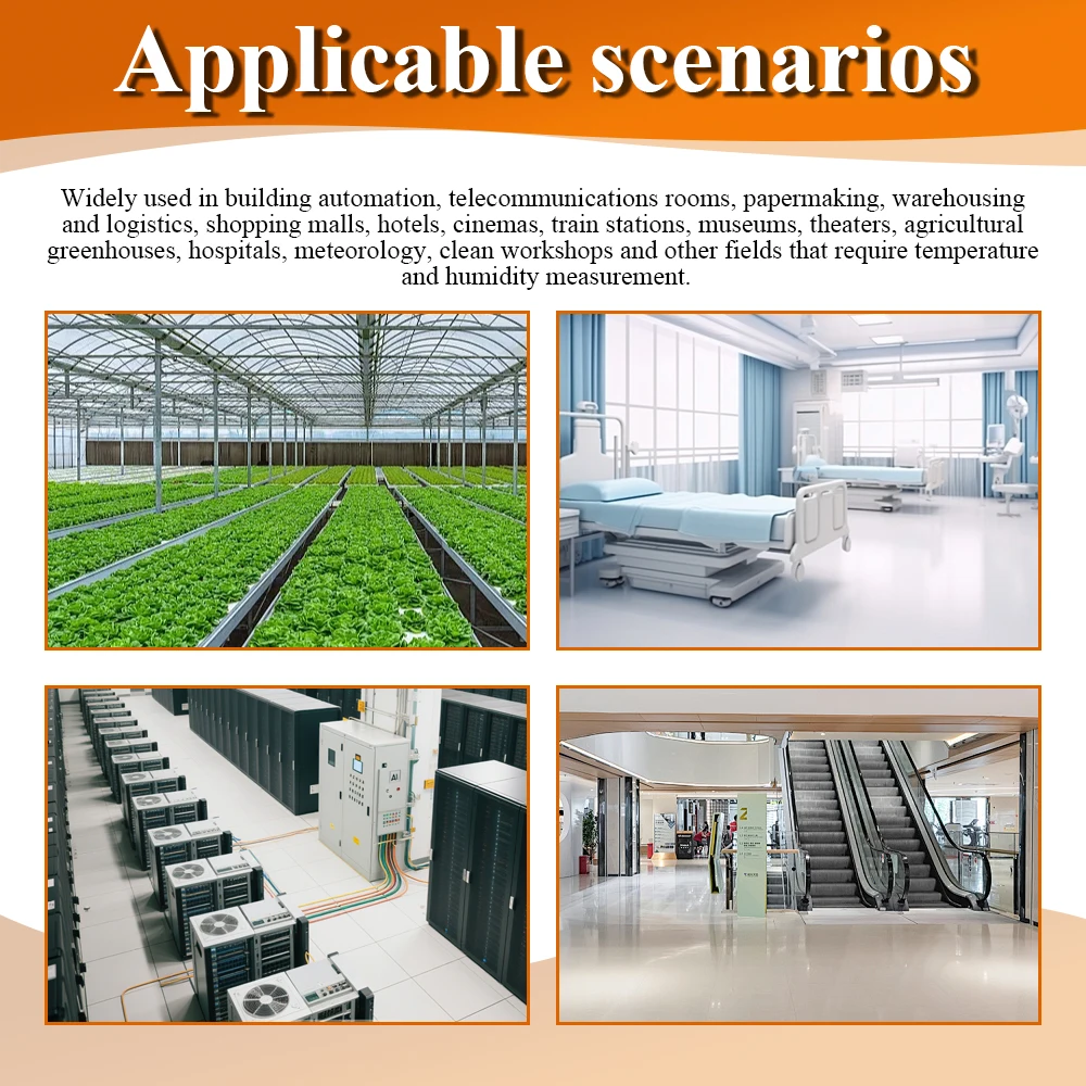 Ampliamente utilizado en el control automático de edificios, salas de telecomunicaciones, fabricación de papel, logística de almacenamiento, centros comerciales, hoteles, cines, estaciones ferroviarias, museos, teatros, invernaderos agrícolas, hospitales, meteorología, talleres limpios y otras áreas que necesitan medir la temperatura y humedad del aire..