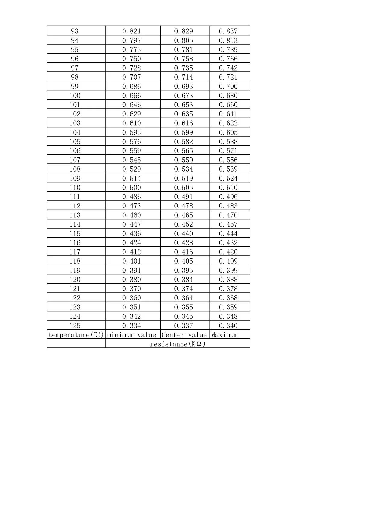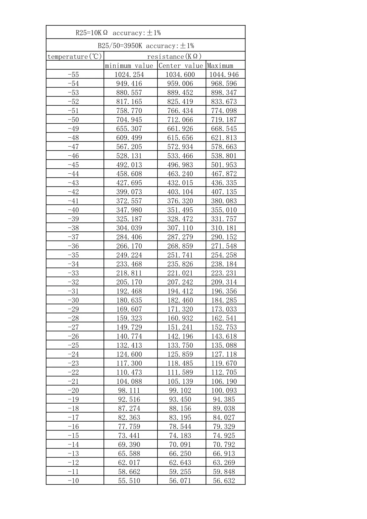 Tabla característica de temperatura 10K B3950