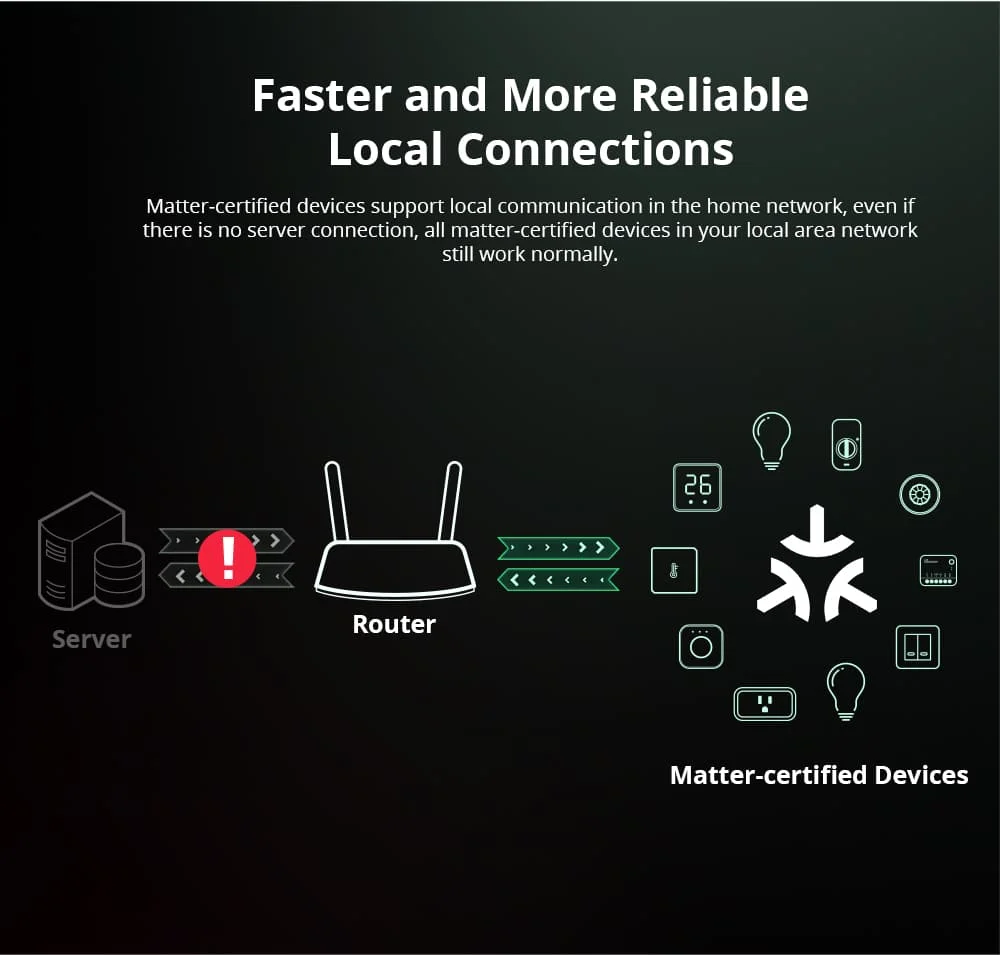 MINIR4M es el primer dispositivo Matter de SONOFF, puede reconocer y trabajar con otras marcas de dispositivos Matter end e integrarse en plataformas habilitadas para Matter, como Apple Home, Google Home, Alexa, etc.Controlar todos los dispositivos inteligentes a través de una aplicación ya no es una fantasía.Los dispositivos con certificación de materia admiten la comunicación local en la red doméstica, incluso si la red está desconectada, MINIR4M aún funciona normalmente, con una capacidad de respuesta más rápida y una mejor confiabilidad.Agregar MINIR4M a aplicaciones compatibles con Matter es fácil.Simplemente escanee el código Matter QR proporcionado con su aplicación Compatible Matter y MINIR4M se configura fácilmente siguiendo los pasos de la aplicación.
