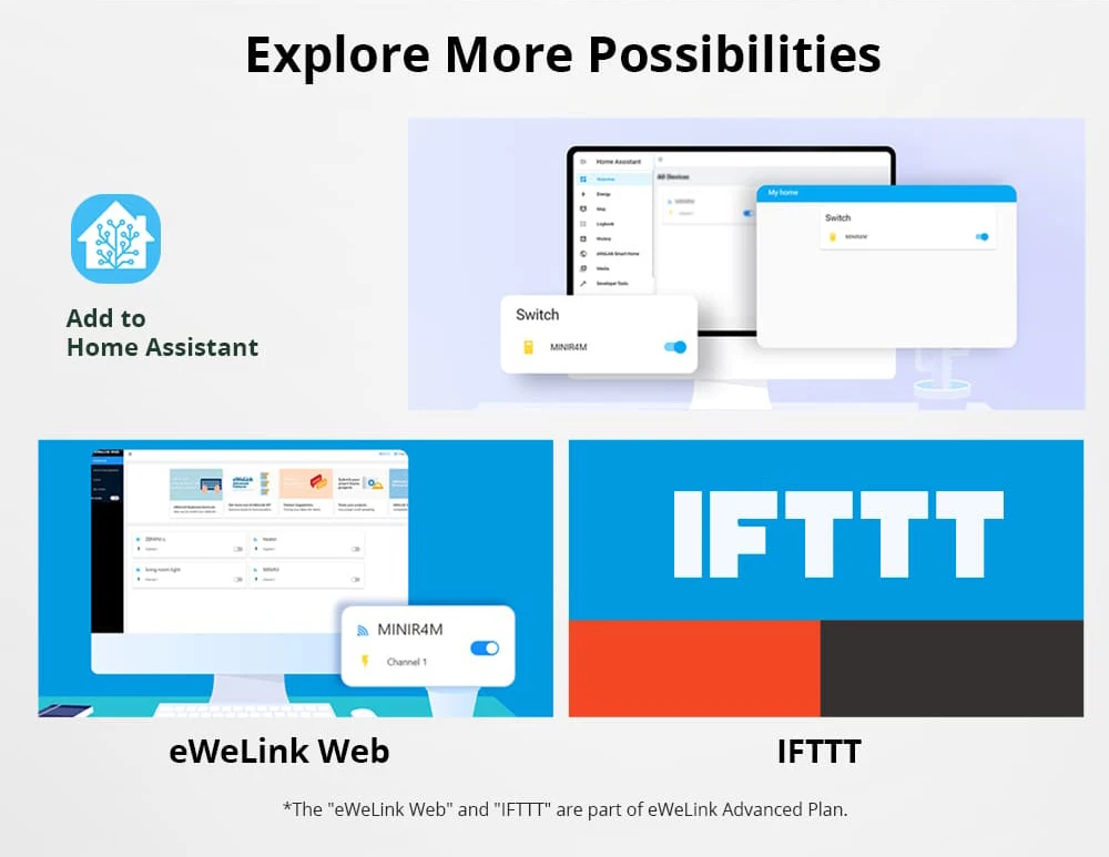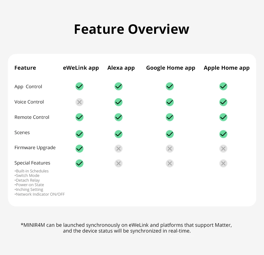 【Compatible con Matter】SONOFF MINIR4M es un dispositivo certificado por Matter, puede funcionar con otras marcas de dispositivos finales Matter e integrarse en plataformas habilitadas para Matter, como Alexa, Apple Home, Google Home, etc.Controlar todos los dispositivos inteligentes a través de una aplicación ya no es una fantasía.
