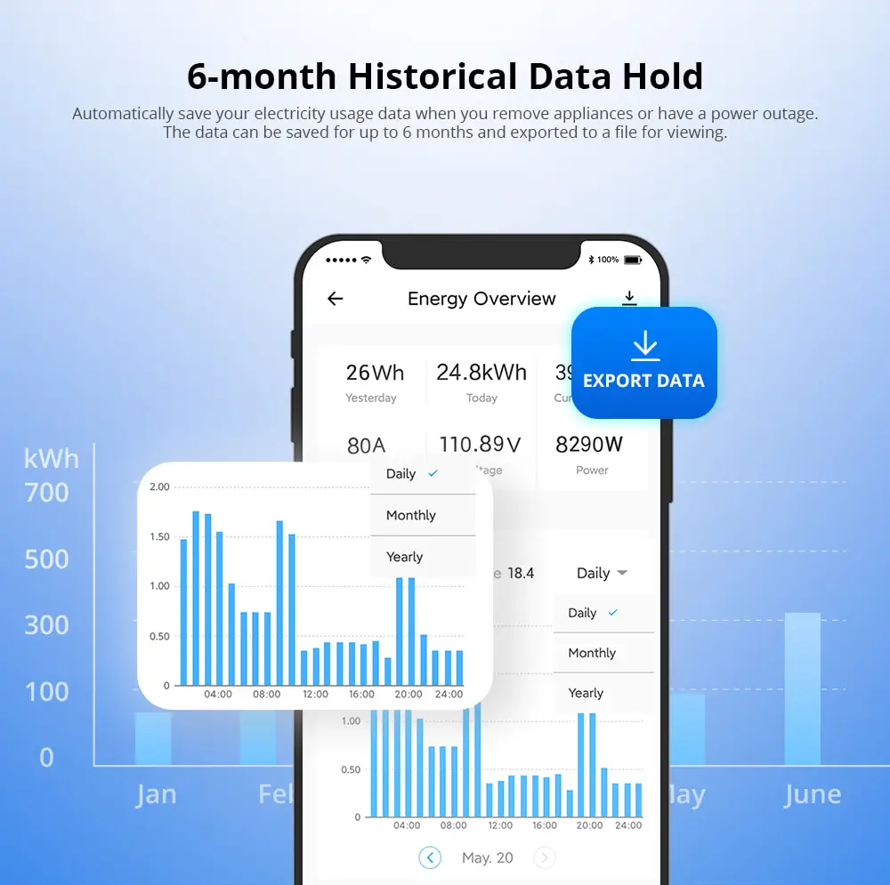 【Mantenimiento de datos históricos de 6 meses】Guarde automáticamente sus datos de uso de electricidad cuando retire los electrodomésticos o tenga un corte de energía.Los datos se pueden guardar hasta por 6 meses y exportar a un archivo para visualización.