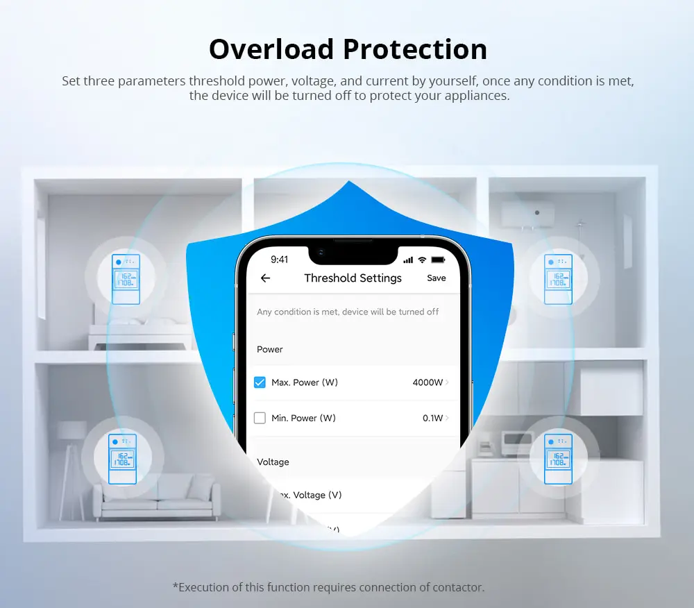 Personalice la configuración para satisfacer sus necesidades.Configure umbrales de potencia, voltaje y corriente, y el dispositivo se apagará automáticamente cuando se cumplan las condiciones, protegiendo sus electrodomésticos.Reciba notificaciones cuando el consumo de energía exceda los umbrales establecidos, lo que le permitirá mantenerse al día con sus objetivos de energía tanto para hoy como para el mes actual.