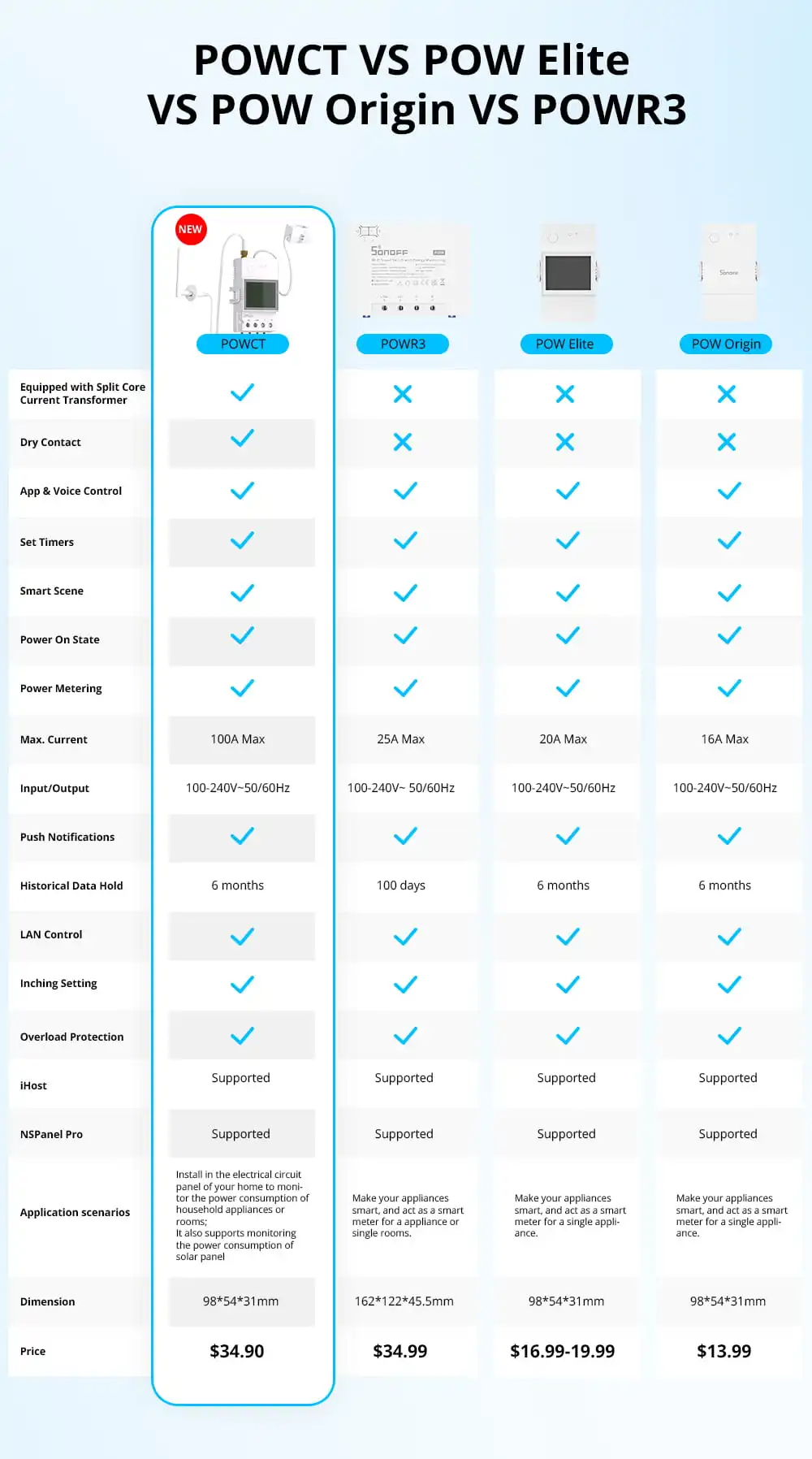 SONOFF POWCT es un producto Wi-Fi que combina modificación de interruptor inteligente, antena y transformador de corriente.Mejore su seguridad y flexibilidad con el sensor Split CT.Al eliminar el contacto físico con cables activos, elimina el riesgo de descarga eléctrica.Simplemente suelte o cierre los pestillos laterales para facilitar el acceso.Con detección de corriente del transformador de hasta 100 A, instálelo en el panel de circuito eléctrico de su hogar para controlar el consumo de energía de los electrodomésticos o habitaciones.