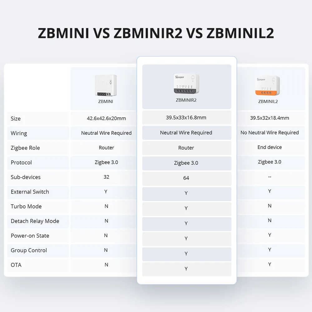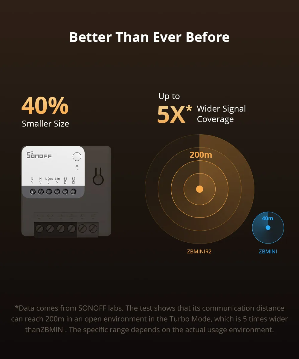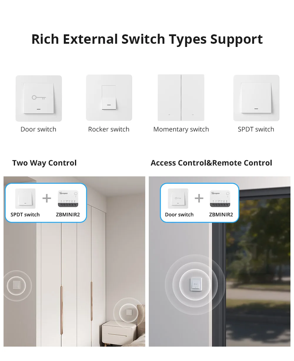 SONOFF ZBMINIR2 es un Zigbee 3 extremadamente compacto.0 interruptor inteligente, capaz de instalarse en una caja de montaje tipo UE/86 tipo/120 y admitir una carga máxima de 10 A, compatible con varios tipos de interruptores externos, actualizando su interruptor externo tradicional en uno inteligente, integrando perfectamente tecnología inteligente. en tu hogar para mayor comodidad y control.