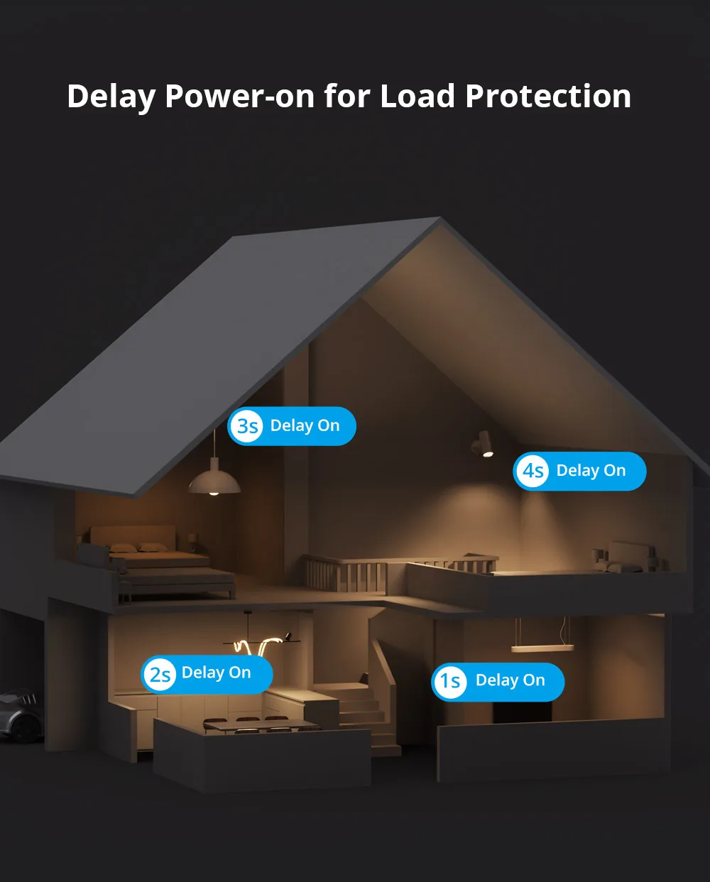 ¿Le preocupa los daños causados por una restauración repentina de energía después de un corte?El encendido retardado es su solución, evitando daños por corrientes altas cuando se encienden varias cargas simultáneamente.
