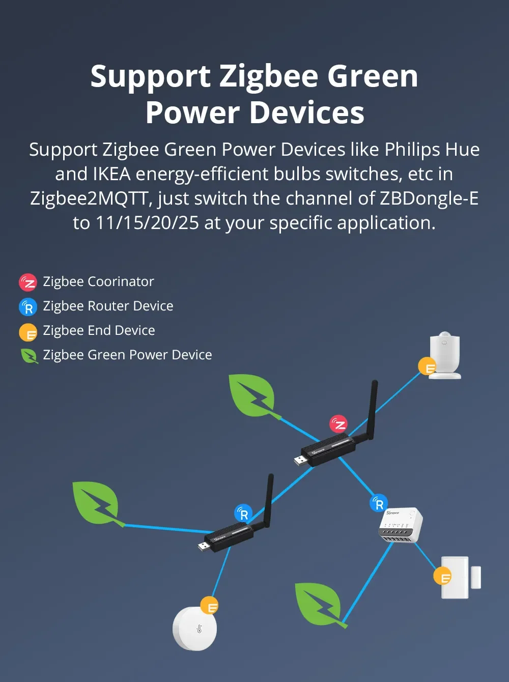 El dongle plus tiene una amplia gama de dispositivos compatibles, como Ewelink BASICZBR3, Ewelink S31 Lite zb, Ewelink SNZB01, Ewelink SNZB02, Ewelink SNZB03, Ewelink SNZB04, Ewelink ZBMINI, Ewelink S26R2ZB y varios subdispositivos de varias marcas o firmware del enrutador flash para ampliar el alcance de la red.
