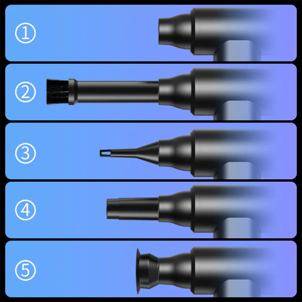 3.Uso versátil:Con 5 boquillas diferentes, el soplador de aire y la aspiradora 2 en 1 satisfacen diversas necesidades de limpieza.Limpia los residuos de computadoras, teclados y sofás, y puede inflar artículos como anillos de natación, cojines de aire y kayaks.