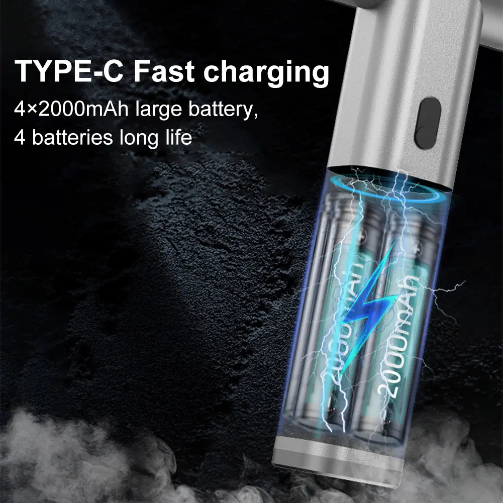 4.Batería y carga mejoradas:El soplador plumero inalámbrico incluye cuatro baterías de litio de 2000 mAh, cargadas mediante un cable tipo C para mayor comodidad.Se carga completamente en 4,5 horas, ofreciendo 1-3 horas de funcionamiento según el nivel de limpieza seleccionado.