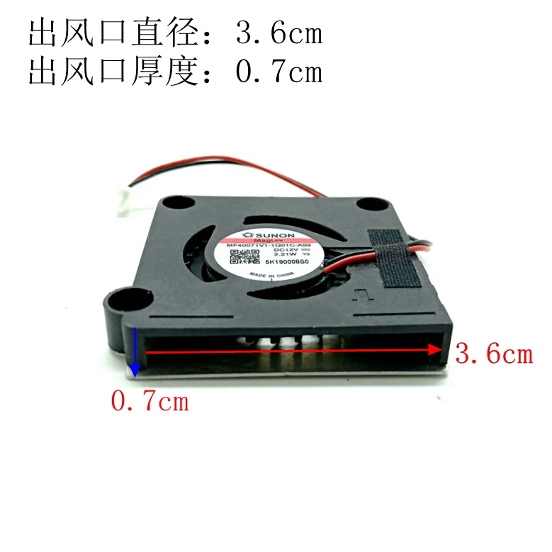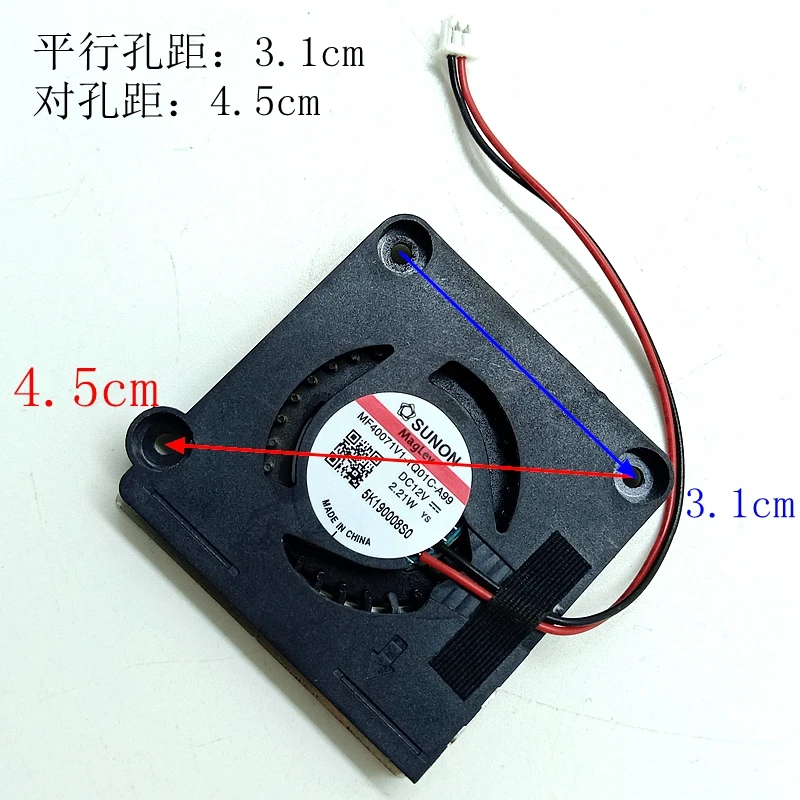 Modelo: mf40071v1-1q01c-a99 Corriente: 12V Voltaje: 2,21 W Tamaño: 40*40*7mm Distancia del agujero paralelo: 3,1 cm Espaciado entre agujeros: 4,5 cm Diámetro de salida: 3,6 cm Grosor de salida de aire: 0,7 cm
