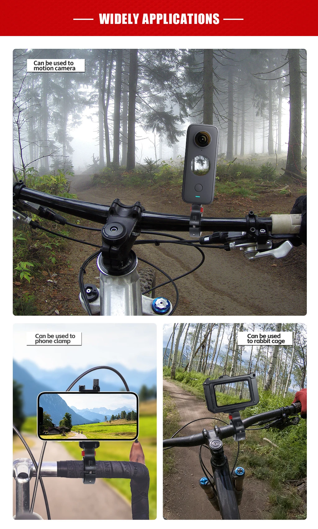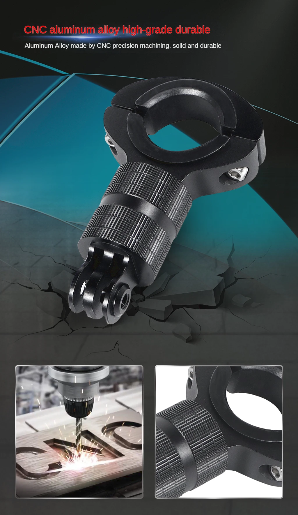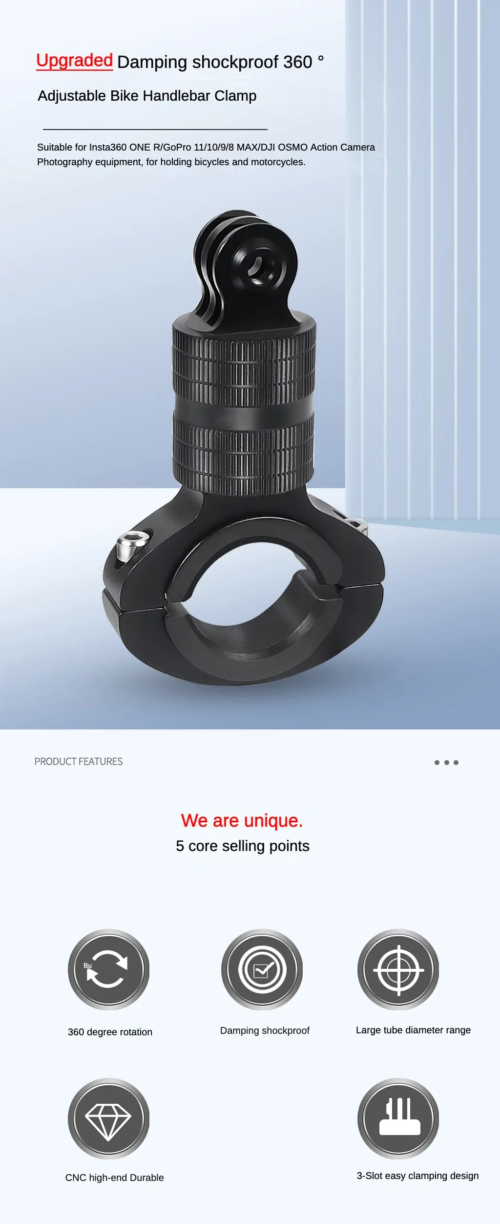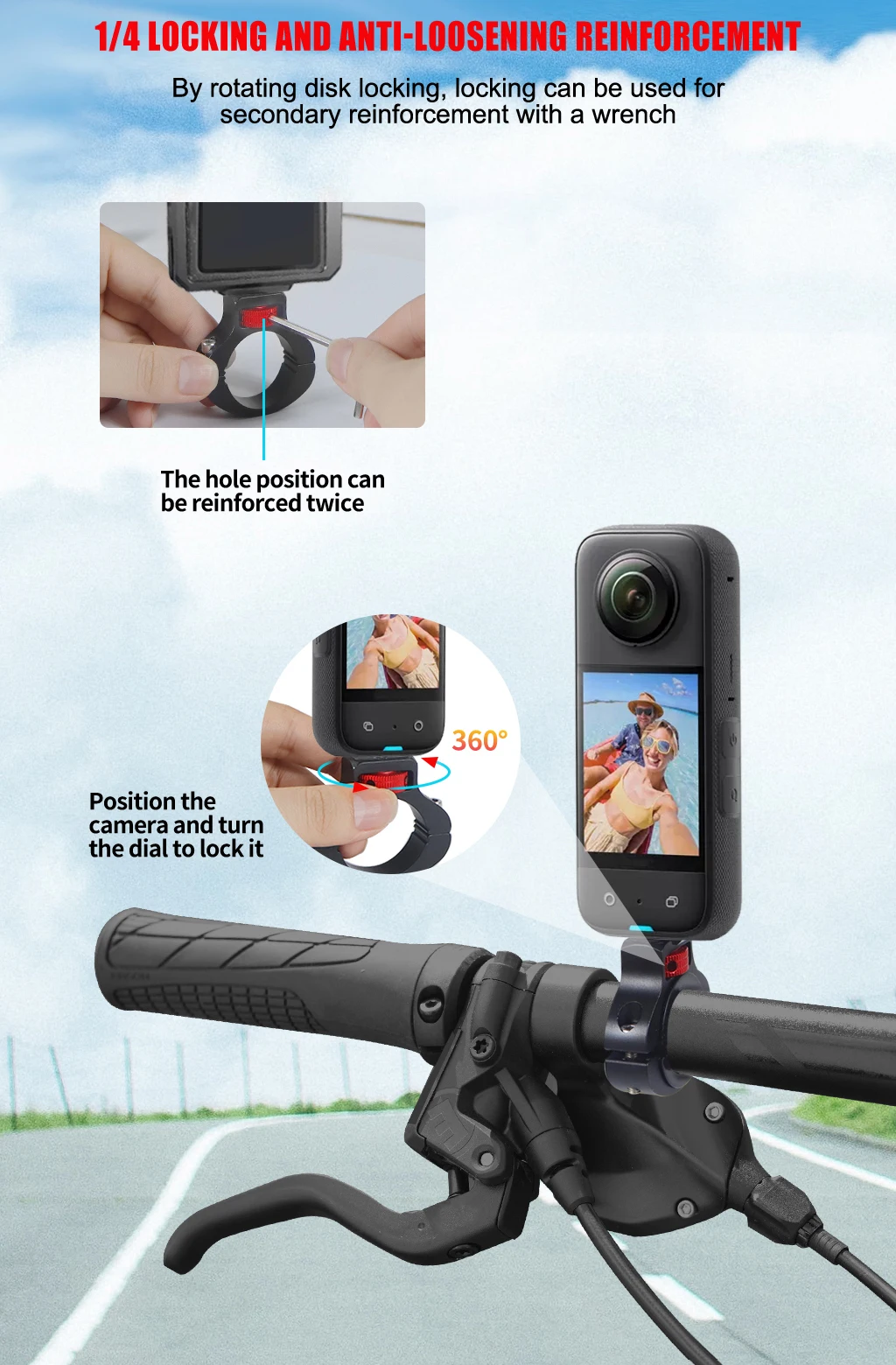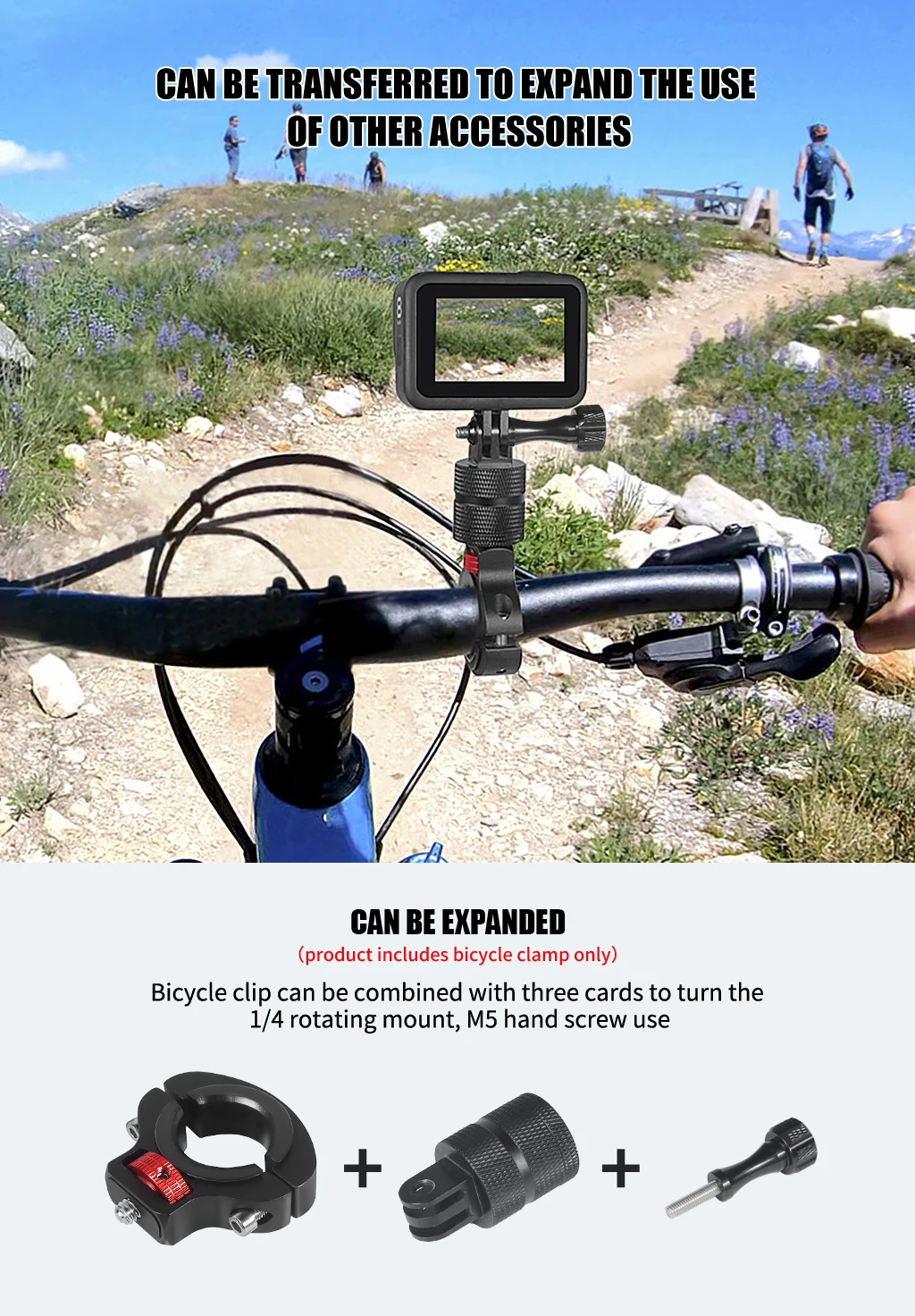 ✅ Compatibilidad universal– Se adapta a GoPro HERO y cámaras de acción de tamaño similar.La abrazadera ajustable se adapta al manillar (22-32 mm de diámetro), ideal para la mayoría de bicicletas, motocicletas y más.