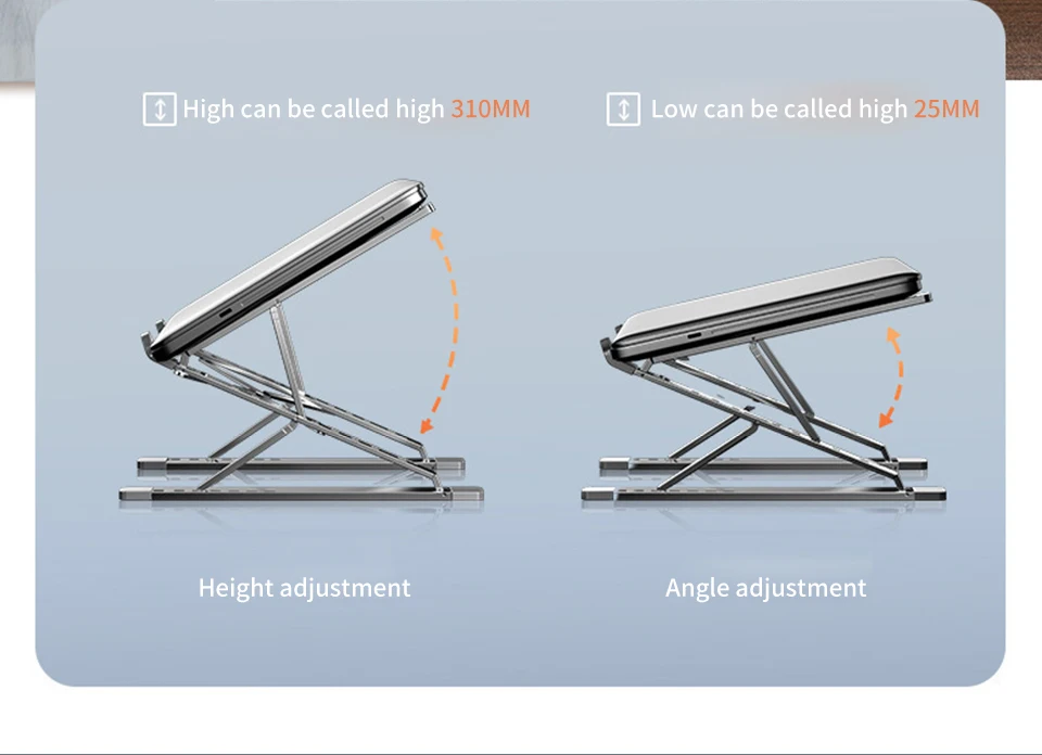 • Portátil y totalmente plegable: diseño plegable creativo y material de aleación de aluminio liviano de alta calidad y el soporte para computadora portátil se puede plegar.