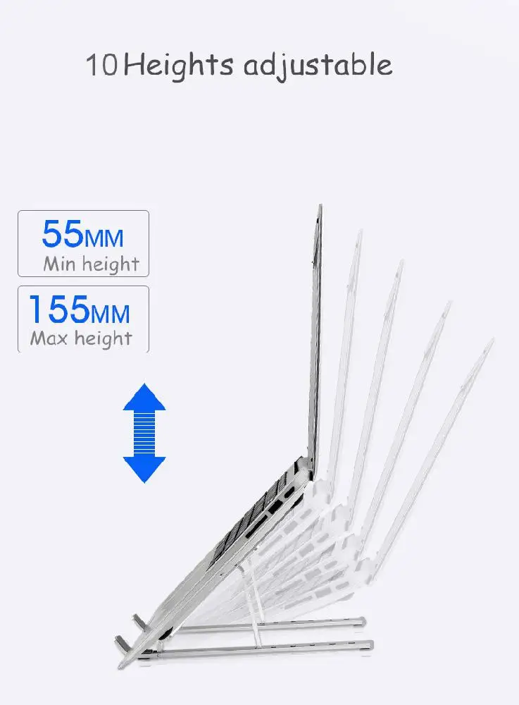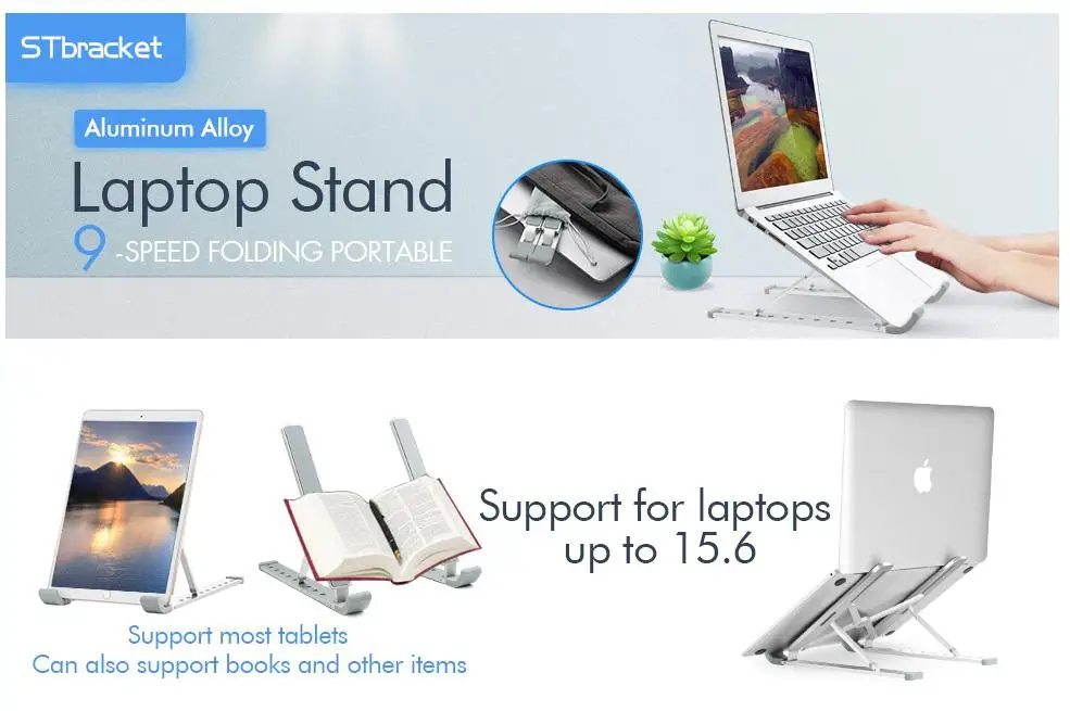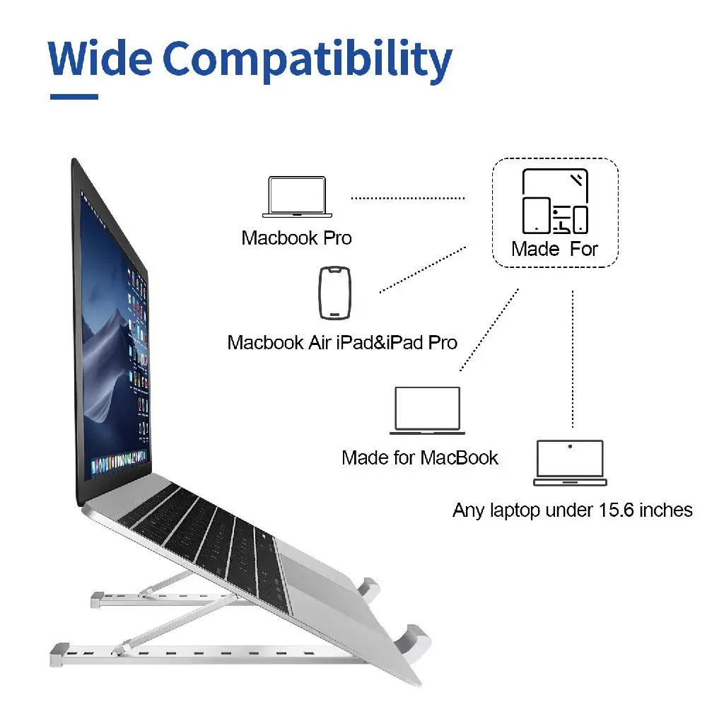El soporte se adapta a portátiles universales de tamaño de pantalla de 11 pulgadas, 13 pulgadas, 14 pulgadas, 15 pulgadas y 16 pulgadas. Este soporte para ordenador portátil mac también admite libros, carpetas y otros artículos de más de 5 pulgadas.