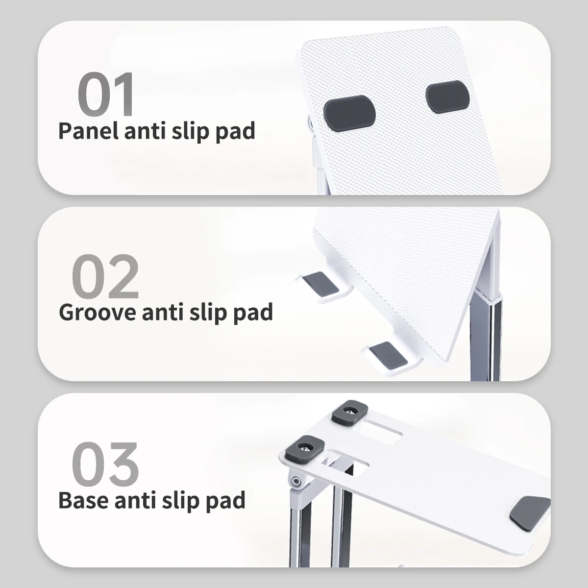 Este soporte para iPad está diseñado para su vida sencilla, no necesita montaje ni ninguna llave Allen para apretarlo. Equipado con una almohadilla de silicona suave en cada punto de apoyo para sujetar sus dispositivos suavemente, no se preocupe por arañazos o deslizamientos.