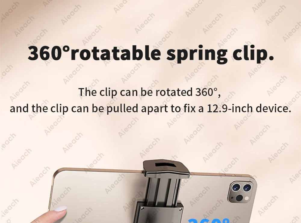 El clip se puede girar 360°, y el clip se puede desmontar para fijar un dispositivo de 12,9 pulgadas.