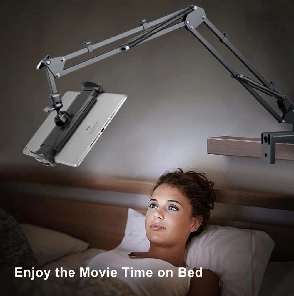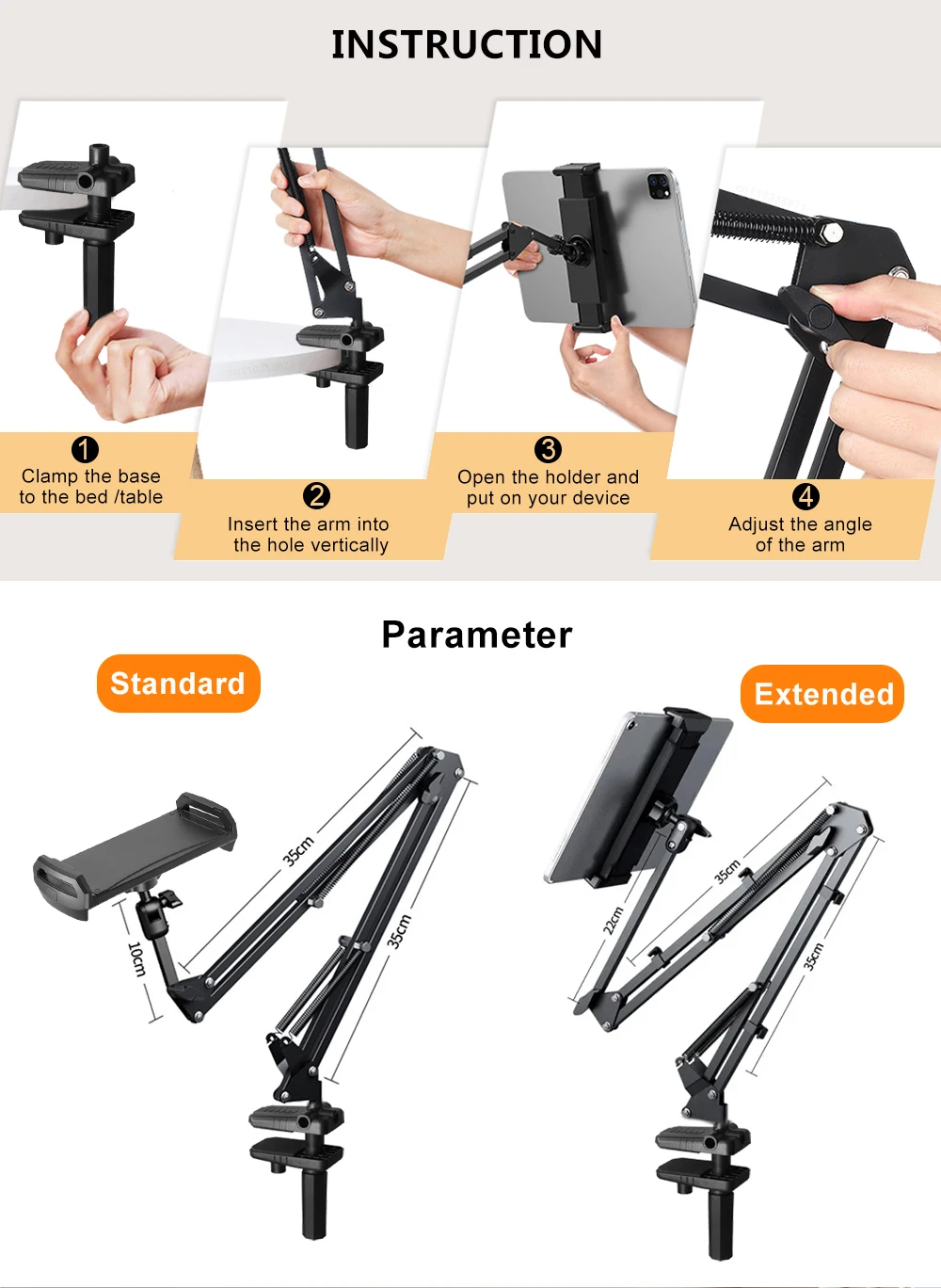 ▶【Ideal para leer y mirar】 Con el objetivo de evitar dolores de cuello y articulaciones debido al uso prolongado de la tableta, diseñamos este soporte para tableta basado en abrazadera de brazo largo.Puede agarrar la tableta y el teléfono con gran capacidad con muchos ángulos de visión y funcionar como un buen compañero para tabletas en diversas ocasiones, como ver películas, tener tiempo facial para realizar videollamadas, leer con el iPad, ver recetas mientras cocina en la cocina.
