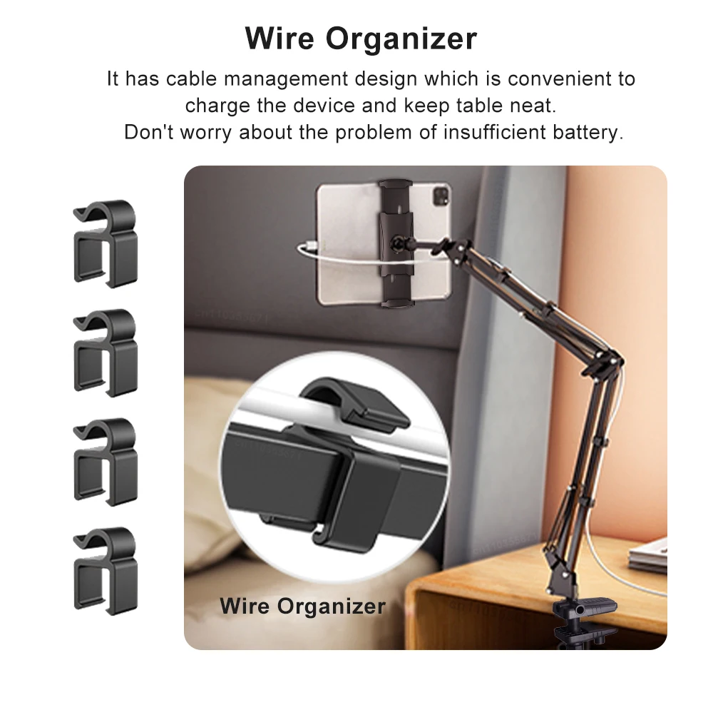 ▶【Fácil instalación】No se necesitan herramientas, se puede colocar ampliamente en tablas de cama, gabinetes, mesas, estanterías o cualquier superficie de hasta 40 mm de grosor.La base de la abrazadera presenta una estructura de bloqueo de tornillo, combinada con almohadillas de goma antideslizantes de EVA, no solo protege los muebles a prueba de rayones, sino también para obtener un agarre más fuerte.Además, tiene un diseño de gestión de cables que es conveniente para cargar el dispositivo y mantener la mesa ordenada.