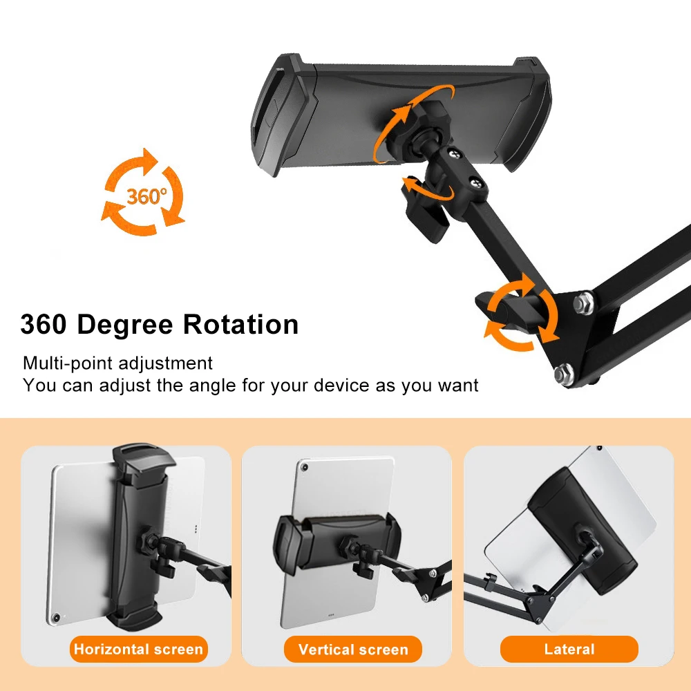 ▶【Alta flexibilidad】Con brazos de acero al carbono de 2 secciones y soporte para tableta giratorio de 360 grados, puede usarlo en múltiples ángulos.Doble el brazo y gire el soporte a la posición de visualización más cómoda ya sea que esté sentado, de pie o acostado, lo hará cómodo y lo protegerá del dolor de cuello y hombros.