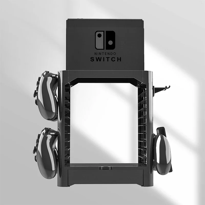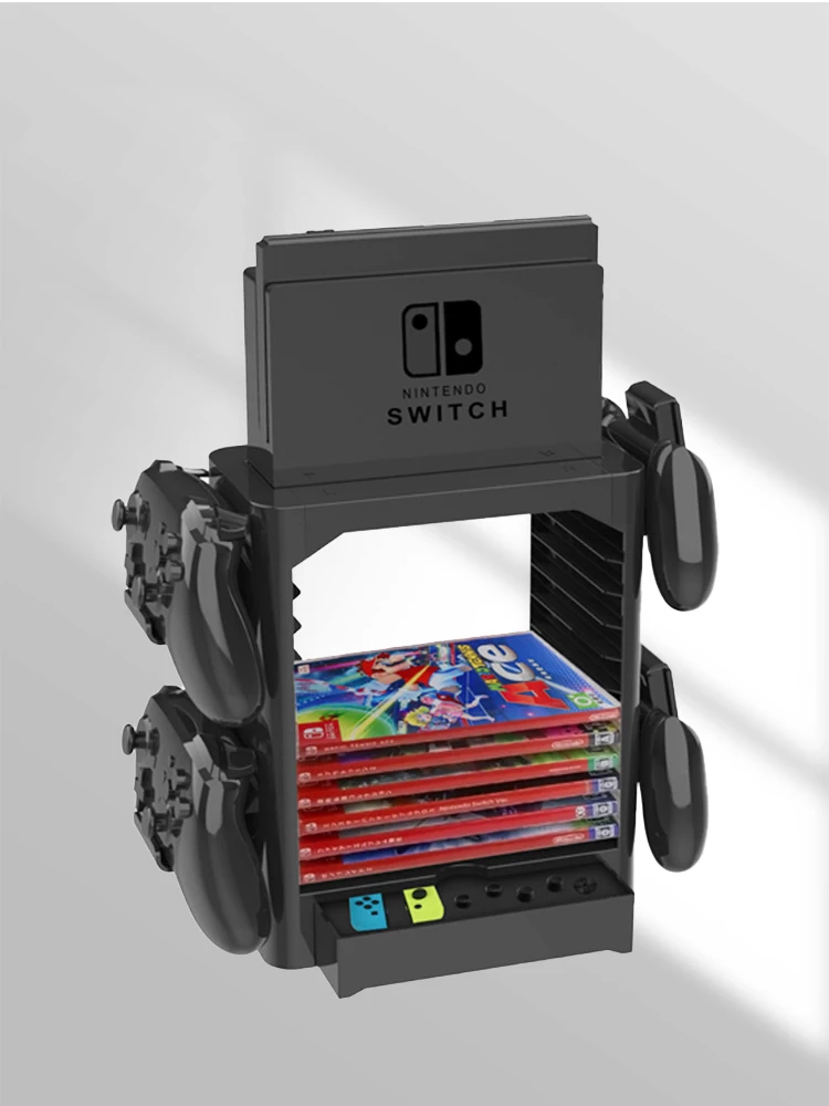 Soporte de almacenamiento de tarjetas de juego multifunción, soporte de torre, soporte de controlador de estante para Nintendo Switch con 4 soportes para controlador y almacenamiento de estuche para tarjetas de juego de 10 capas y 1 cajón y soporte para muelle.