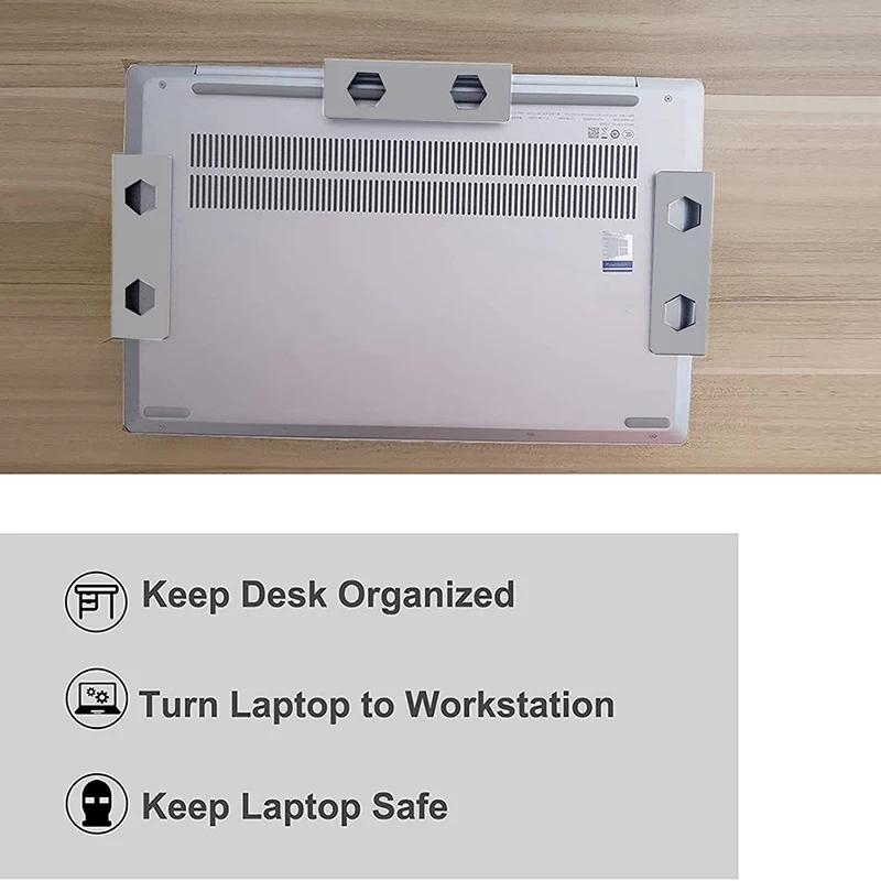 Coloque el portátil en el soporte y Marque las ubicaciones de los soportes debajo del escritorio. Coloque cada soporte en las ubicaciones marcadas. Asegure cada soporte con tornillos con destornillador.