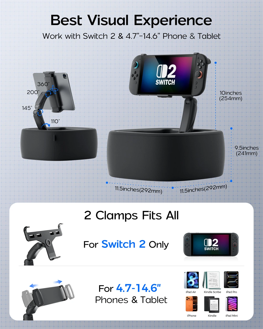 Abrazaderas duales para equipos de juegos y más:Equipe su soporte de almohada para juegos con dos abrazaderas especializadas, una diseñada específicamente para equipos de juegos y una abrazadera universal que se adapta a la mayoría de teléfonos, tabletas y Kindle.Esta versatilidad le permite jugar con una guía o un vídeo montado justo al lado de su pantalla principal.