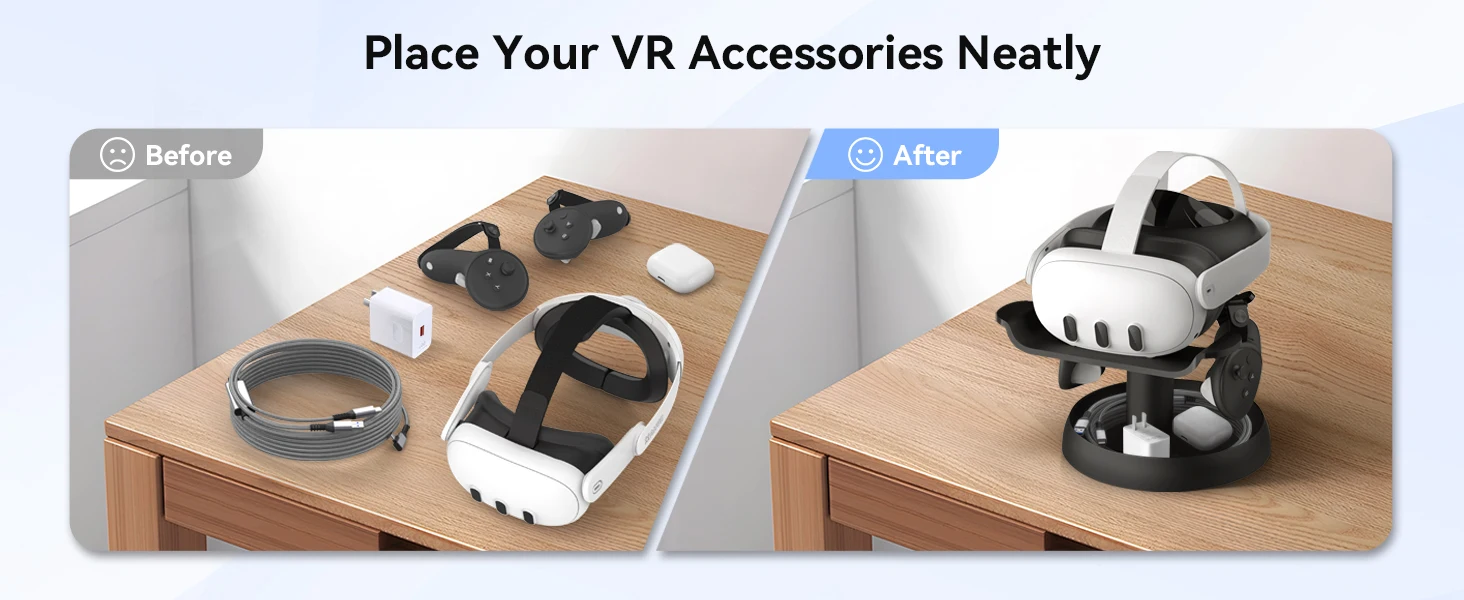 [Espacio de almacenamiento diversificado] Almacenamiento diversificado y conveniente para satisfacer el almacenamiento de múltiples accesorios Quest 3/Quest 2.La bandeja redonda inferior puede almacenar mejor los controladores Quest 3 y el gancho del soporte puede almacenar controladores con cubiertas de manijas.