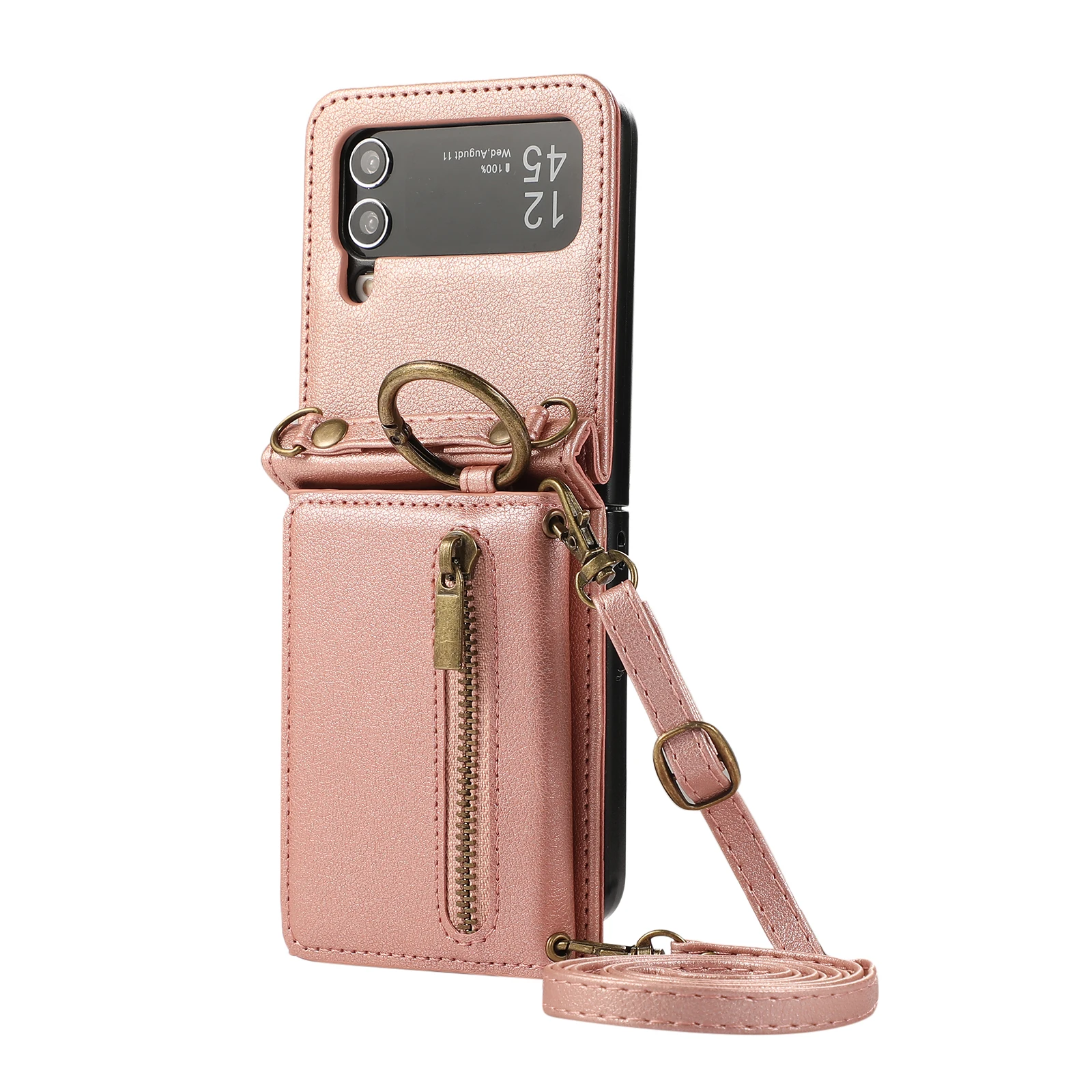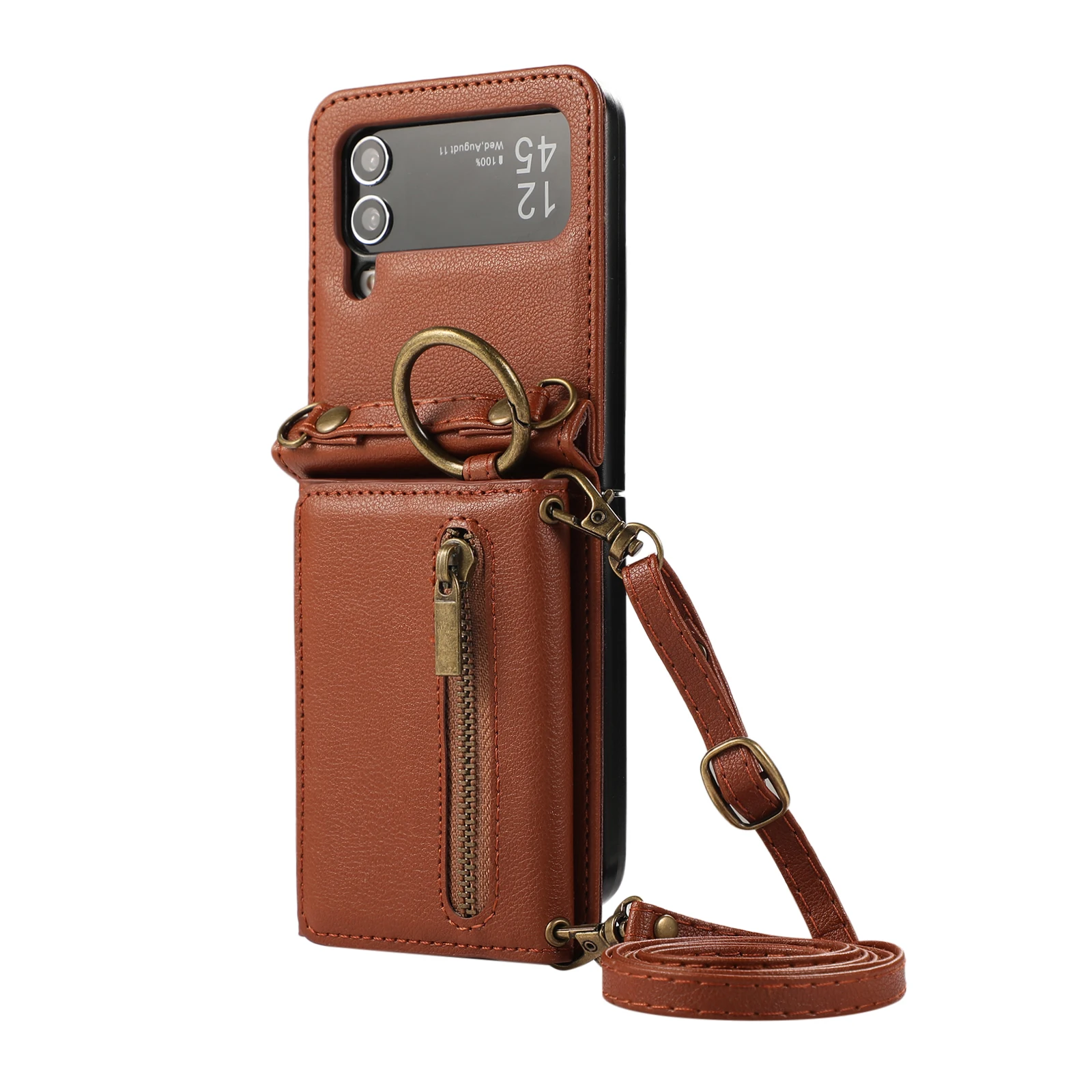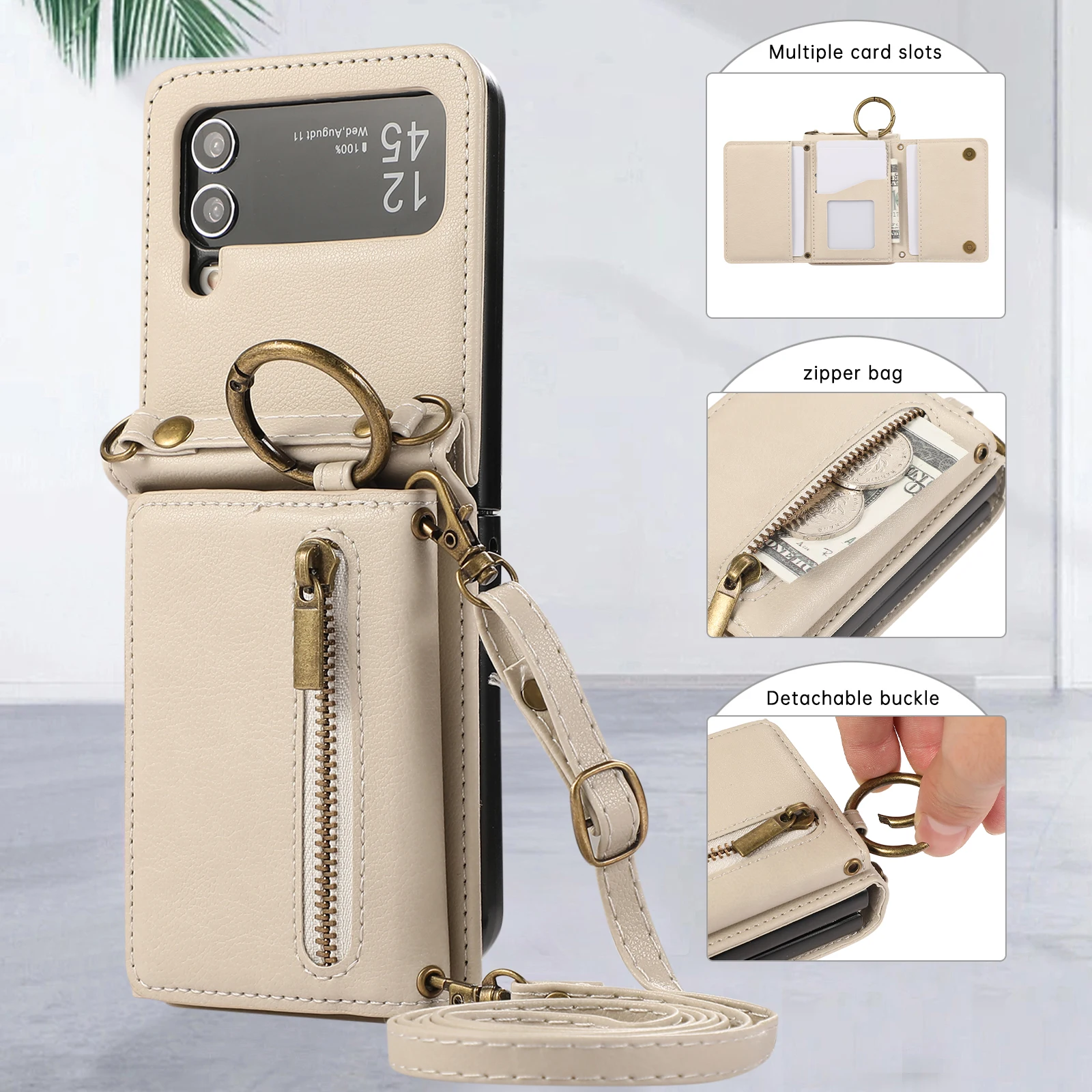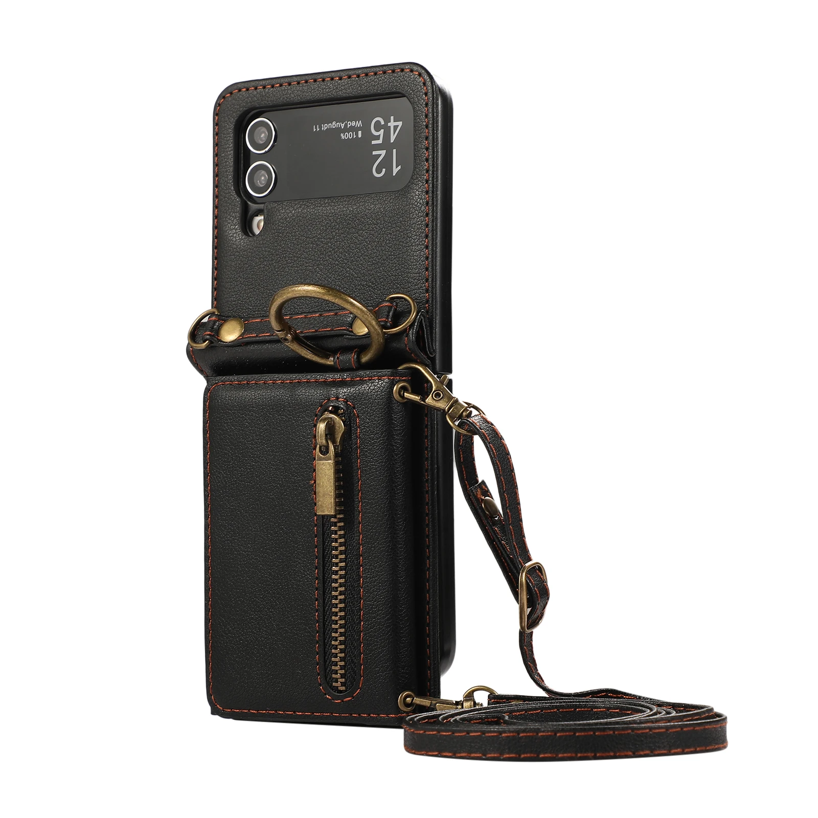 Soporte de anillo con cordón para tarjetas con cremallera, Funda de cuero tipo billetera Solt para Samsung Galaxy Z Flip 6 5 4 3, funda cruzada con soporte triple plegable