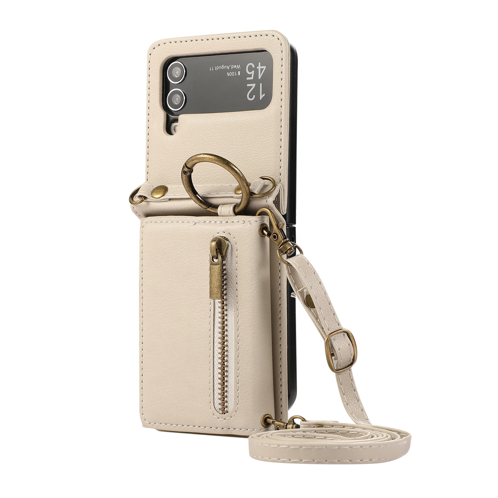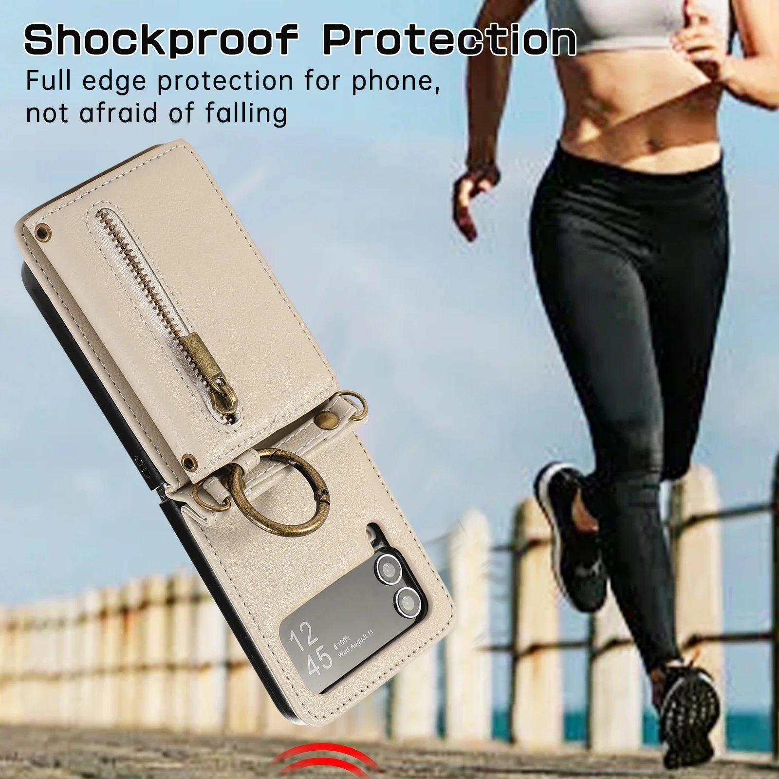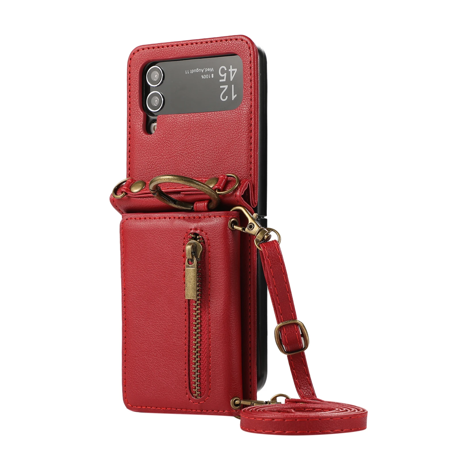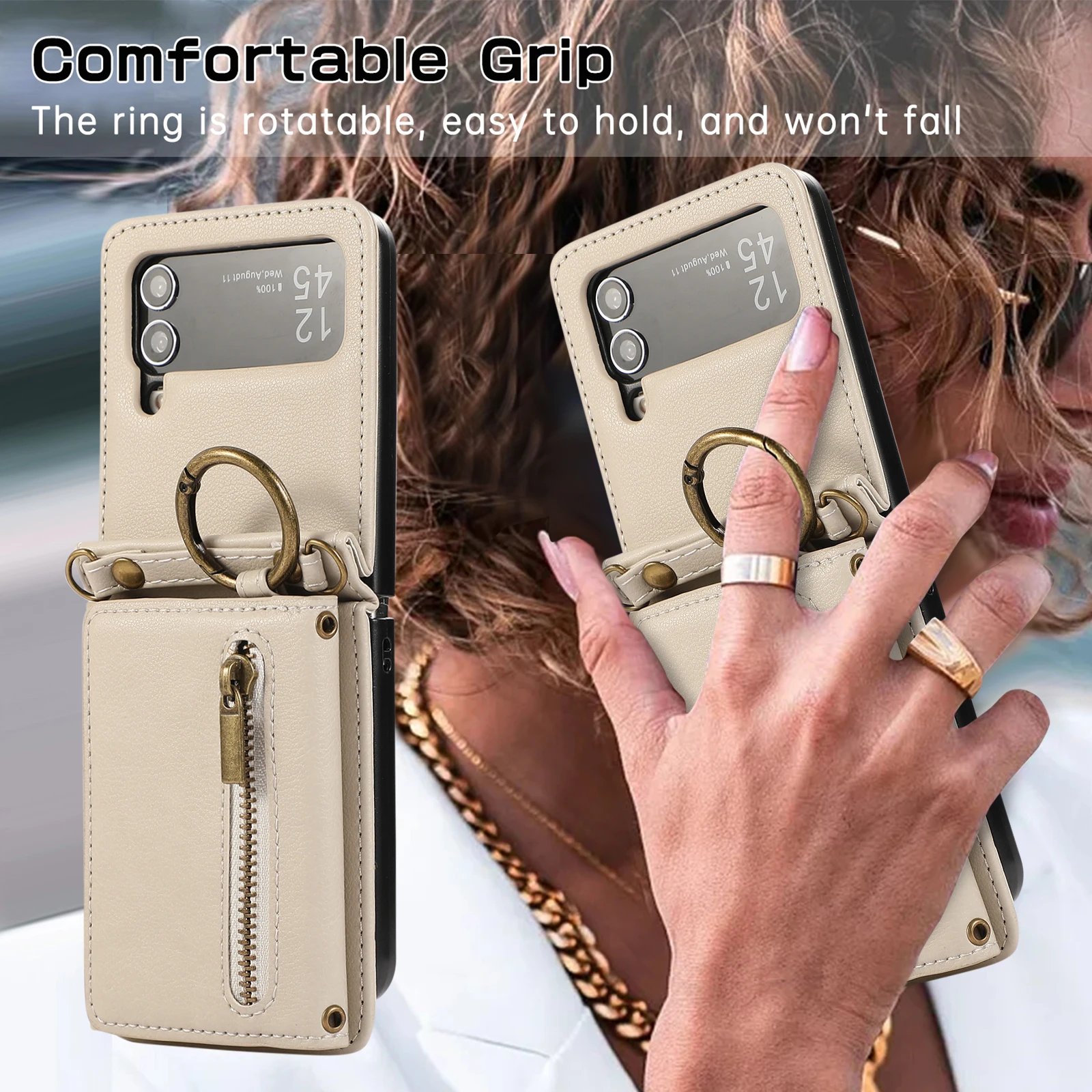 Soporte de anillo con cordón para tarjetas con cremallera, Funda de cuero tipo billetera Solt para Samsung Galaxy Z Flip 6 5 4 3, funda cruzada con soporte triple plegable