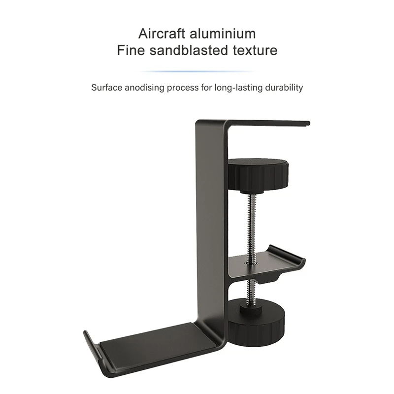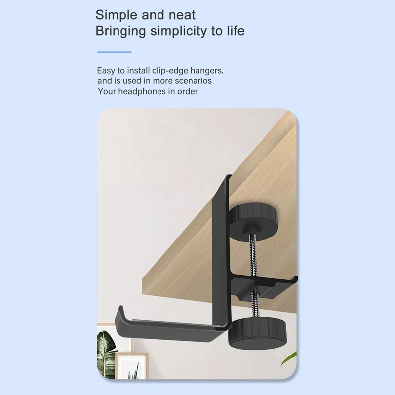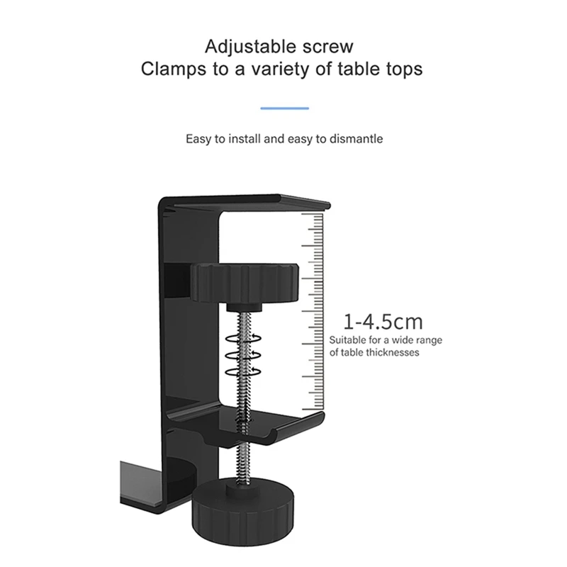 Características: 1. Abrazaderas ajustables: Las abrazaderas son ajustables de 1cm a 4,5 cm. El diseño ajustable permite adaptarse a diferentes grosores de escritorios, mesas o estanterías. Como accesorio para auriculares resistente, duradero y fiable, el soporte para auriculares permite que los auriculares se sienten cómodamente en su soporte mientras se engancha en su escritorio o estante.