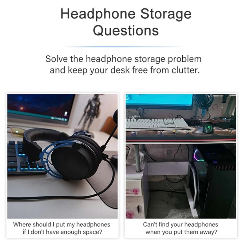 5. Fácil de instalar y usar: no se puede plegar ni girar. Soporte de auriculares para juegos de PC de alta calidad, sin necesidad de instalar herramientas adicionales. También es fácil de desinstalar si desea moverlo, no dejará ninguna marca en la mesa.
