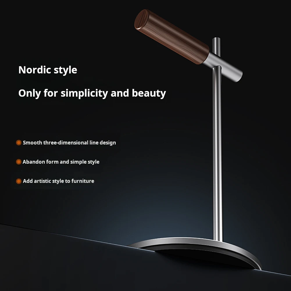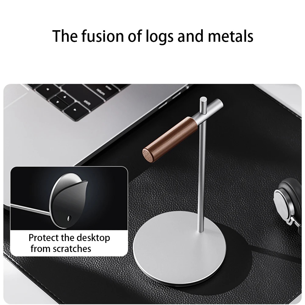Buen pequeño soporte, la base es ancha y tiene un perfil bajo, por lo que es bueno para sostener los auriculares. La punta está hecha de algún tipo de madera y no de plástico.
