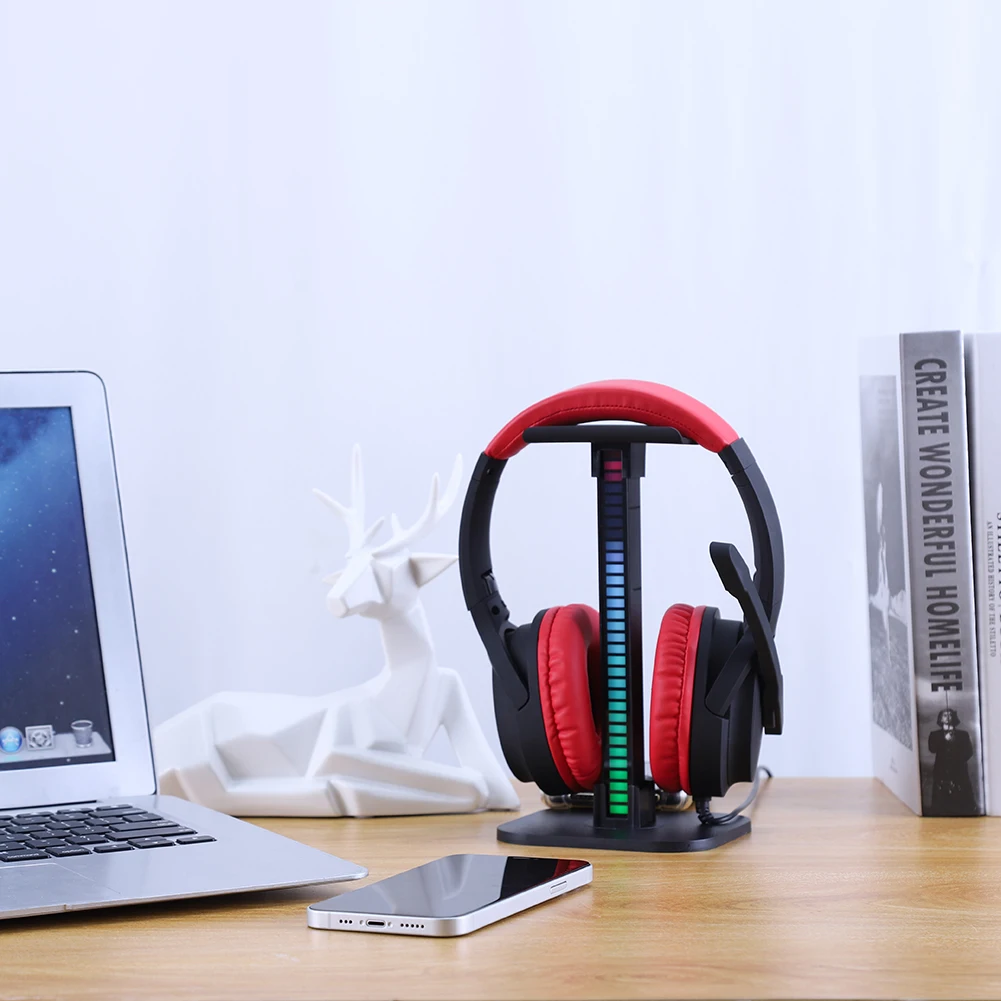Soporte para auriculares RGB para juegos, auriculares supraaurales para computadora, soporte para exhibición de escritorio, colgador de soporte, Base LED/luz de recogida USB, lámpara colorida de atmósfera musical activada por voz para Gamer, accesorios para PC