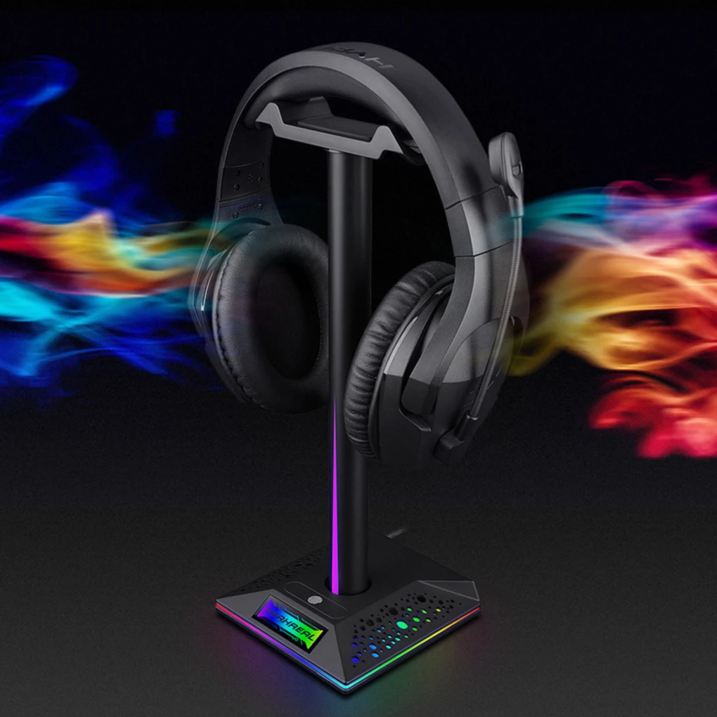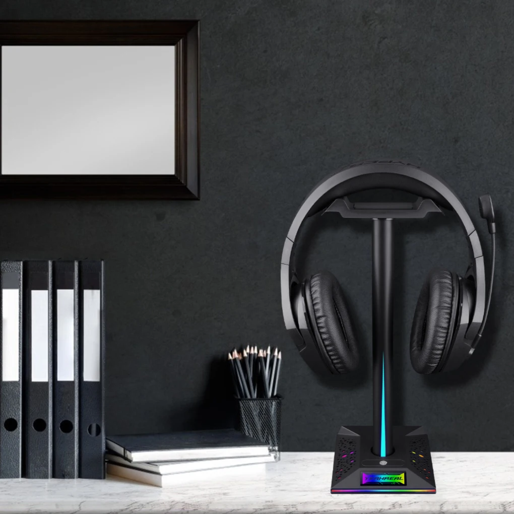 Este soporte para auriculares RGB le permite colocar los auriculares sobre la mesa de forma ordenada y puede llevarlos y usarlos fácilmente.