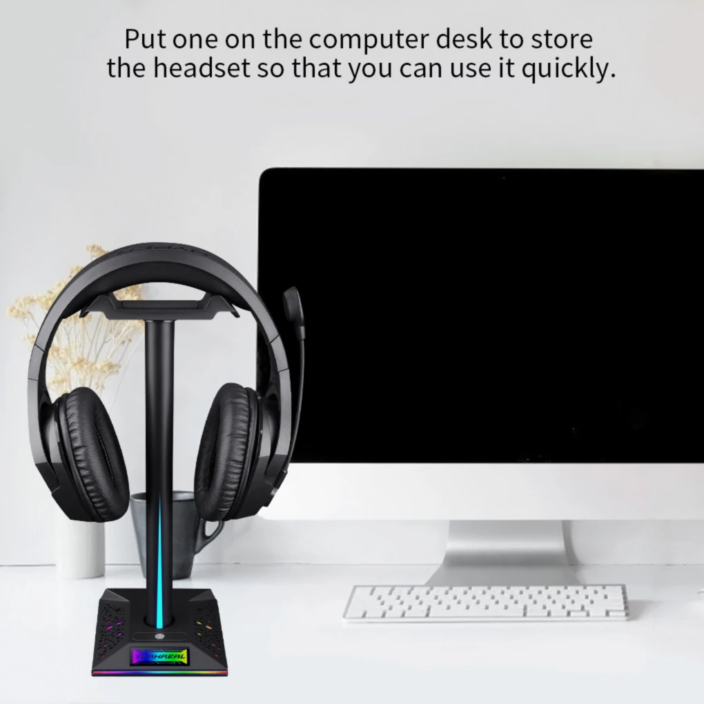 Comprar Soporte de auriculares RGB brillante, mesa de oficina en casa, soporte de auriculares antideslizante con USB Dual