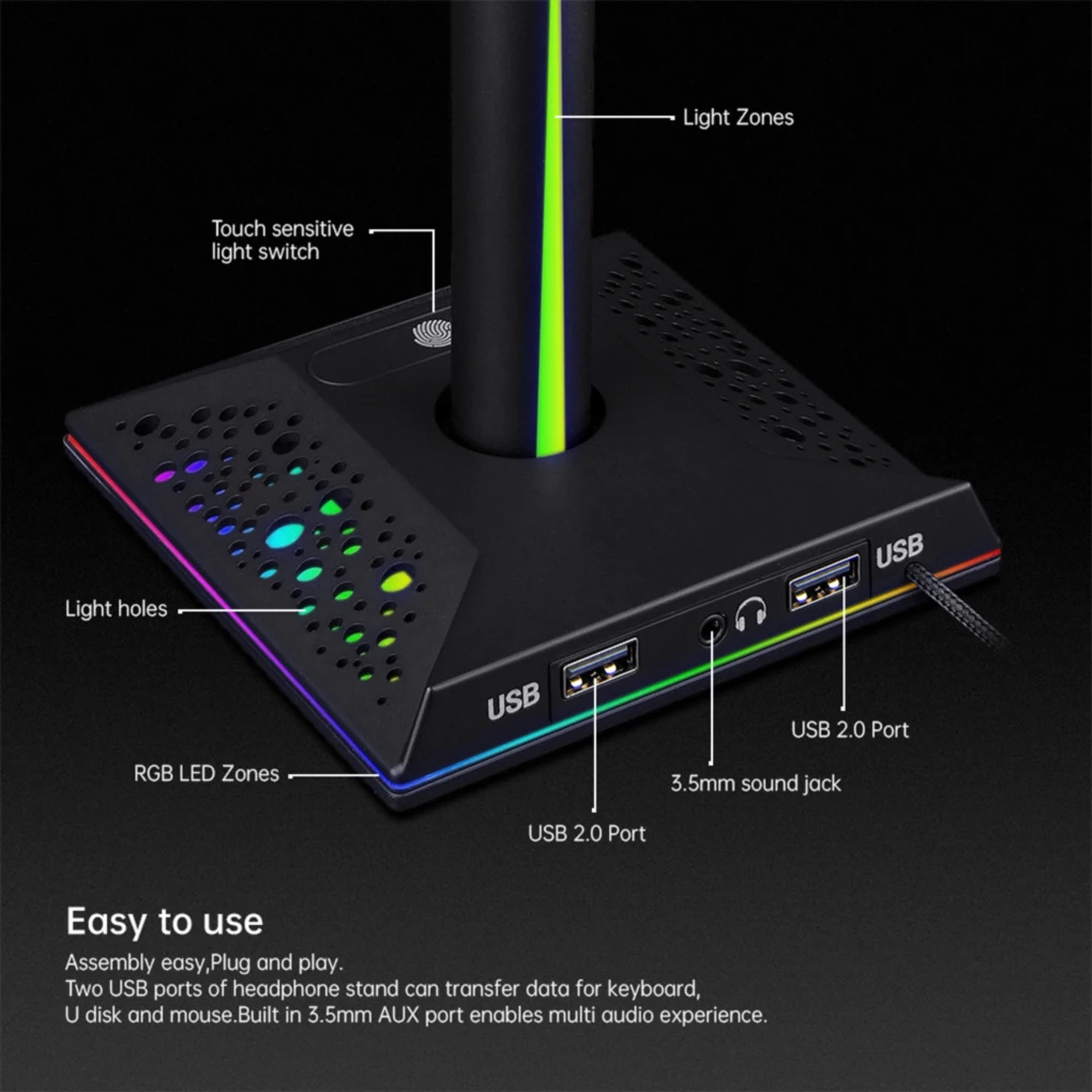 Este soporte para auriculares RGB le permite colocar los auriculares sobre la mesa de forma ordenada y puede llevarlos y usarlos fácilmente.
