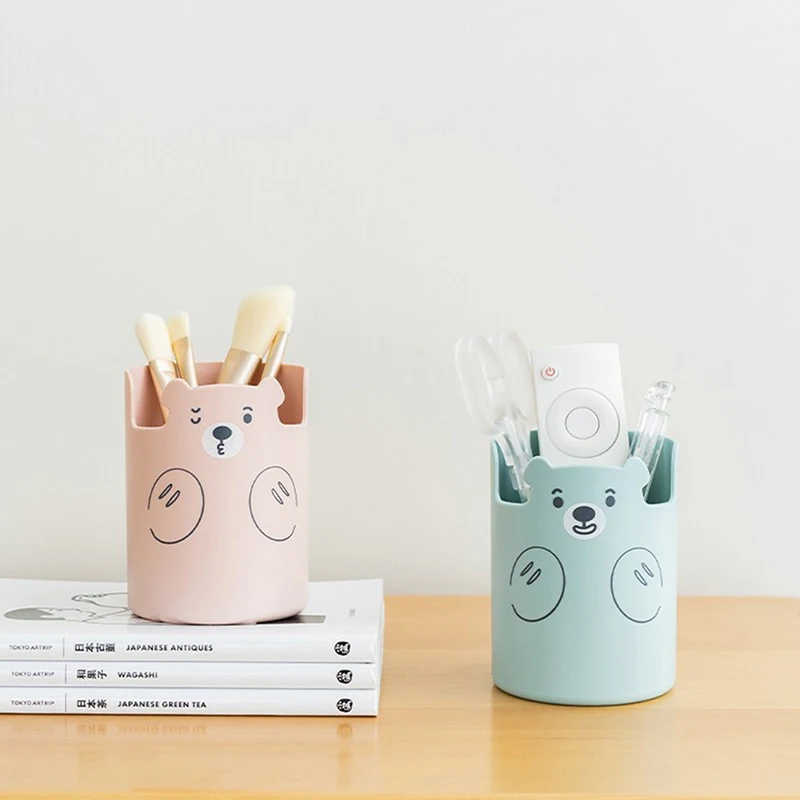 Comprar Soporte de bolígrafo de oso de dibujos animados, caja de almacenamiento redonda para cosméticos y lápiz labial, organizador de bolígrafos de gran capacidad, papelería escolar