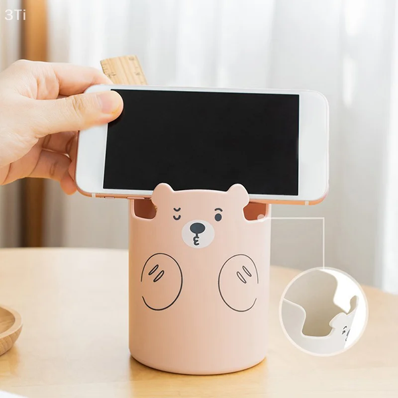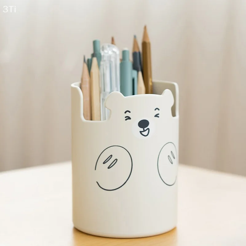 Comprar Soporte de bolígrafo de oso de dibujos animados, caja de almacenamiento redonda para cosméticos y lápiz labial, organizador de bolígrafos de gran capacidad, papelería escolar