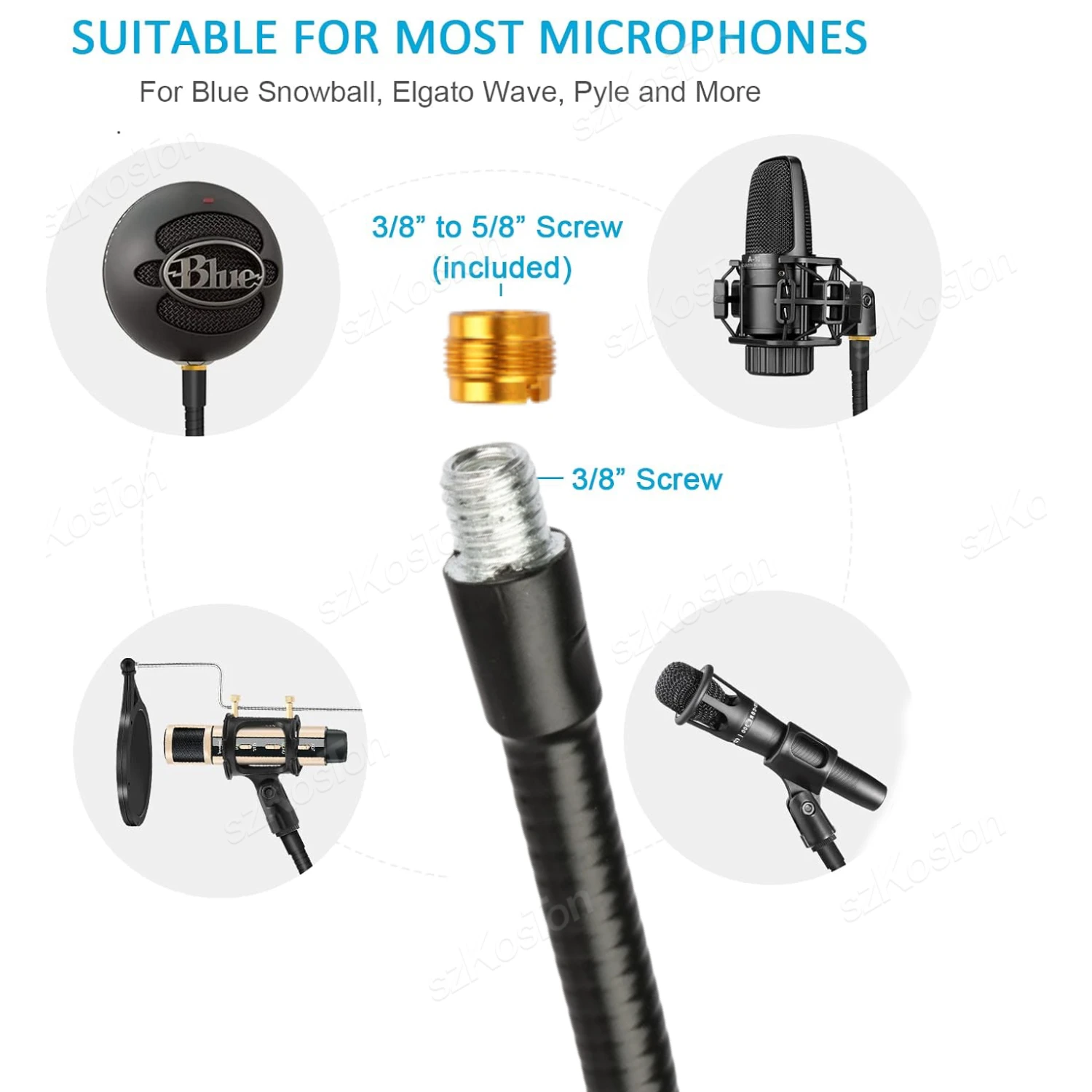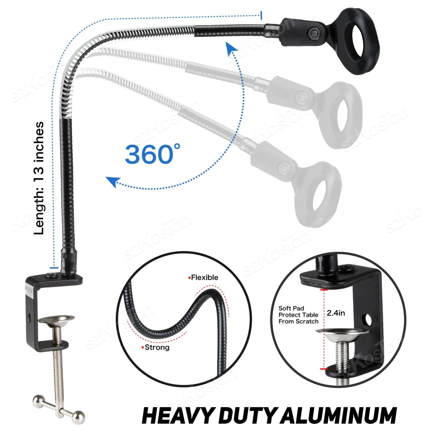 🎤【SOPORTE DE BRAZO DE CUELLO DE GANO VERDADERO 360 ° ACTUALIZADO】 El brazo de nuestro soporte de mesa de micrófono de cuello de cisne adopta mejores materiales y diseño. Tiene mejoras tanto en Estabilidad como en durabilidad. Con brazo largo de 13 pulgadas (33cm), el núcleo sólido de aleación de aluminio de alta calidad hace que el brazo flexible sea lo suficientemente resistente como para sujetar firmemente su micrófono o teléfono móvil, pero flexible para doblarse en cualquier dirección para adaptarse a su ángulo de visión. Szkoston