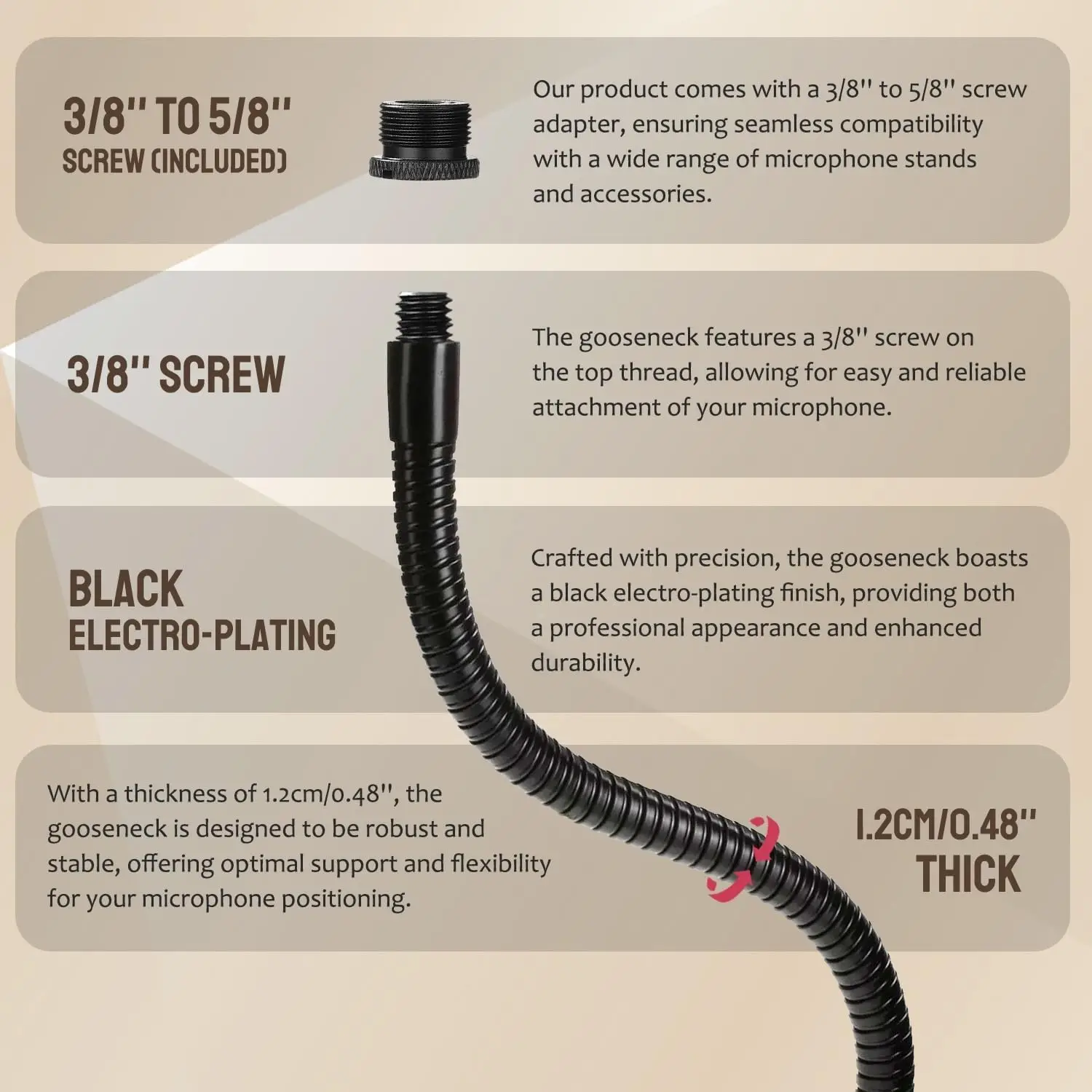 🎤【GRAN FLEXIBILIDAD Y COMPATIBILIDAD】 El brazo de la pluma del cuello de cisne del micrófono puede girar 360 grados mientras ofrece una carga máxima: 3,74 lbs/kg 1,7 (cuando el brazo del cuello de cisne está extendido hasta la mitad). Con un clip de micrófono normal, cuyo diámetro máximo es de 1,3 "/32mm, para micrófonos dinámicos de mano estándar como Shure SM58, Samson Q2U, Shure PGA48, Shure SM7B, etc. El adaptador de tornillo adicional de 3/8" a 5/8 "funciona perfectamente con otros micrófonos.