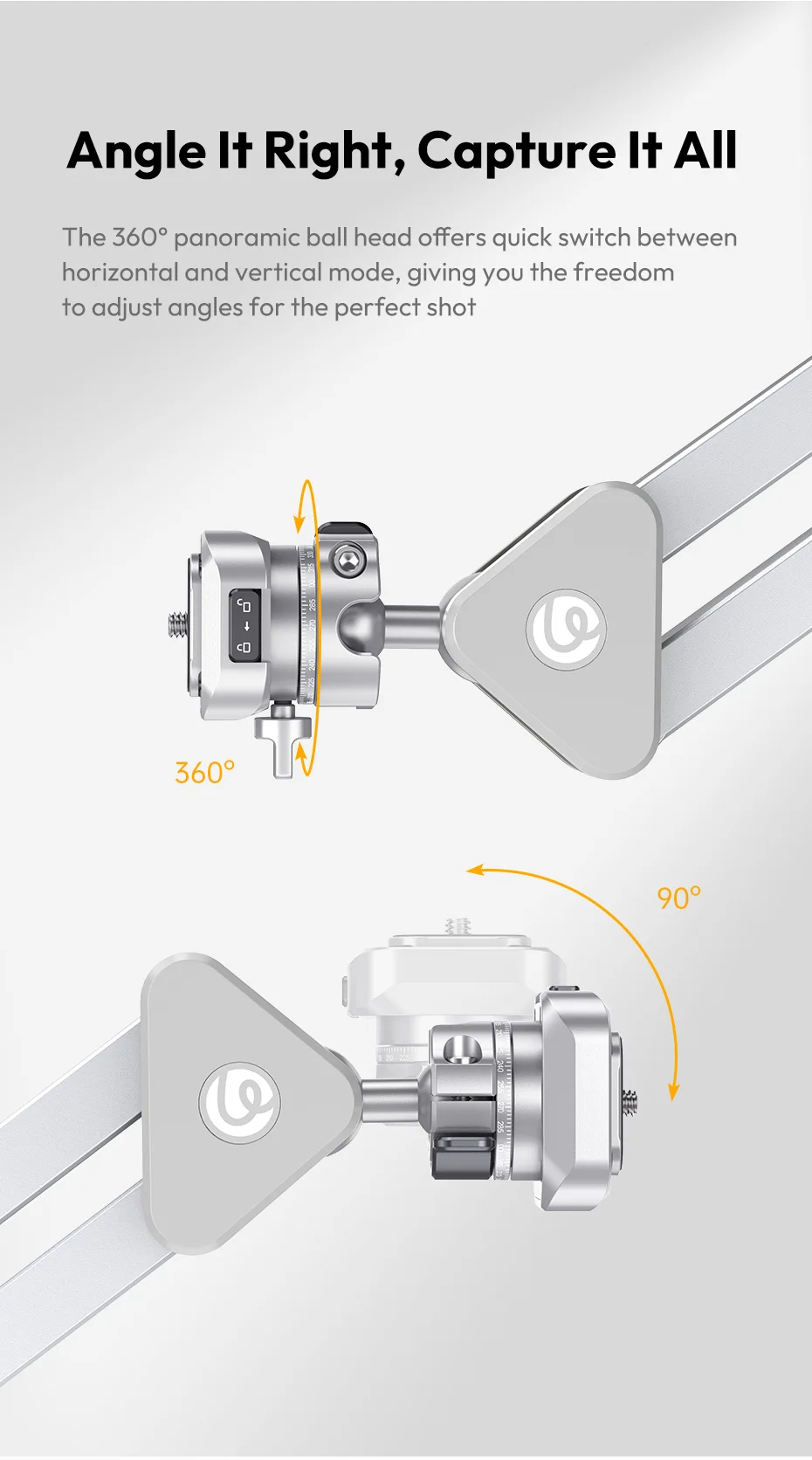 The 360° panoramic ball head offers quick switch between horizontal and vertical mode, giving you the freedom to adjust angles for the perfect shot.