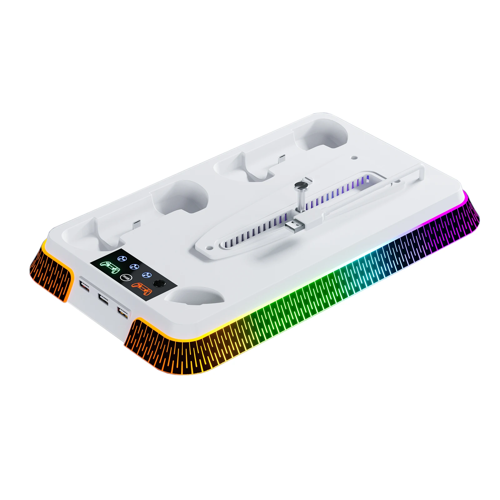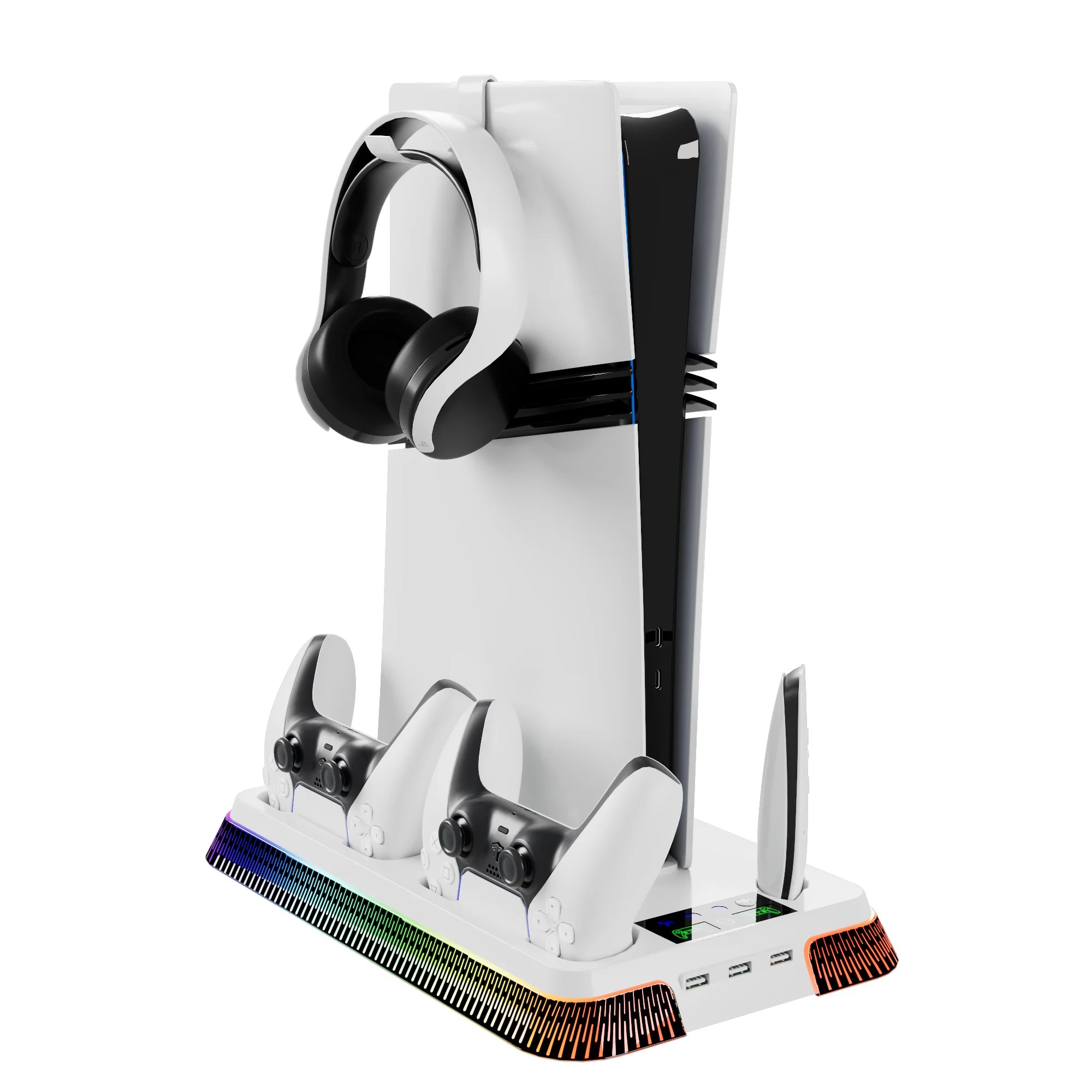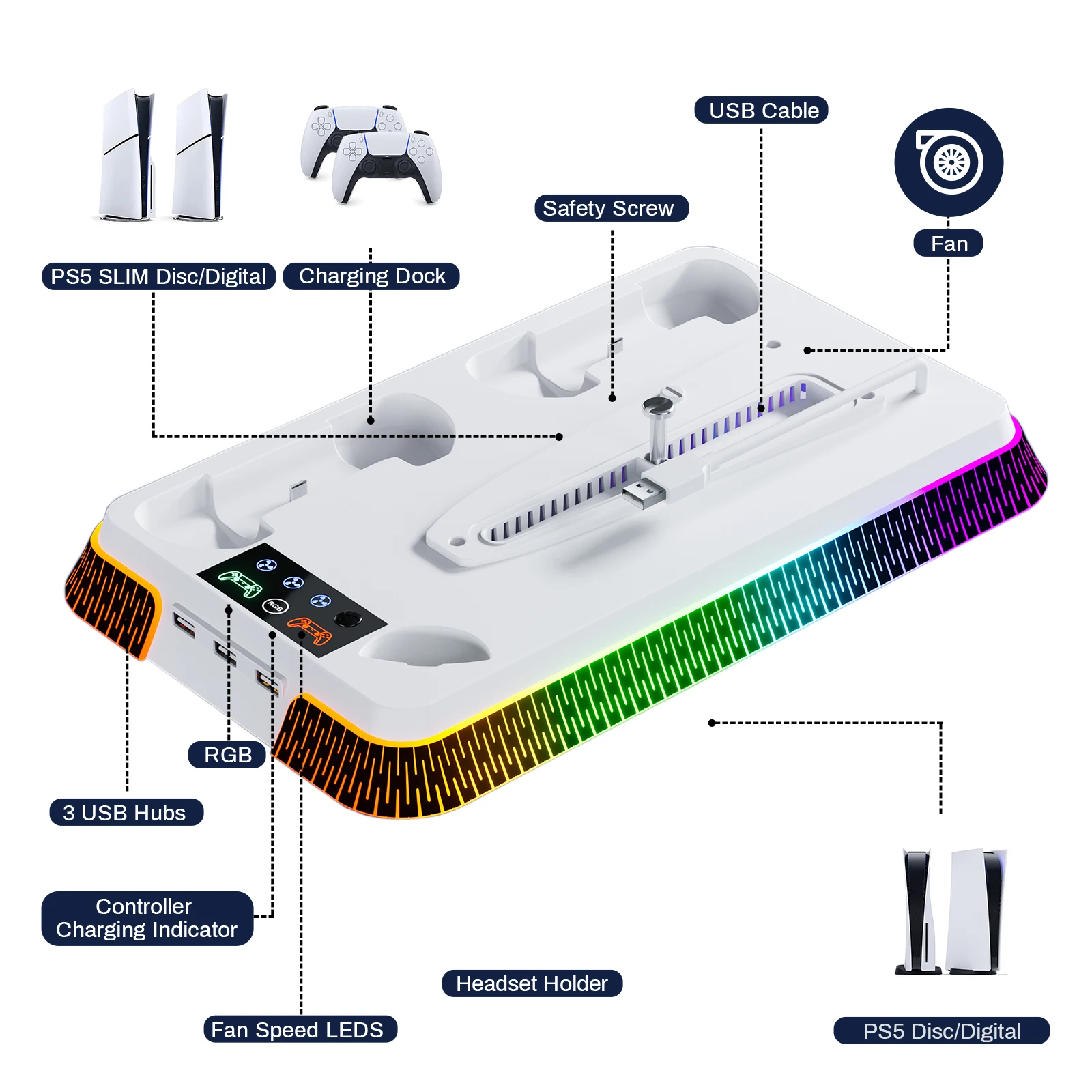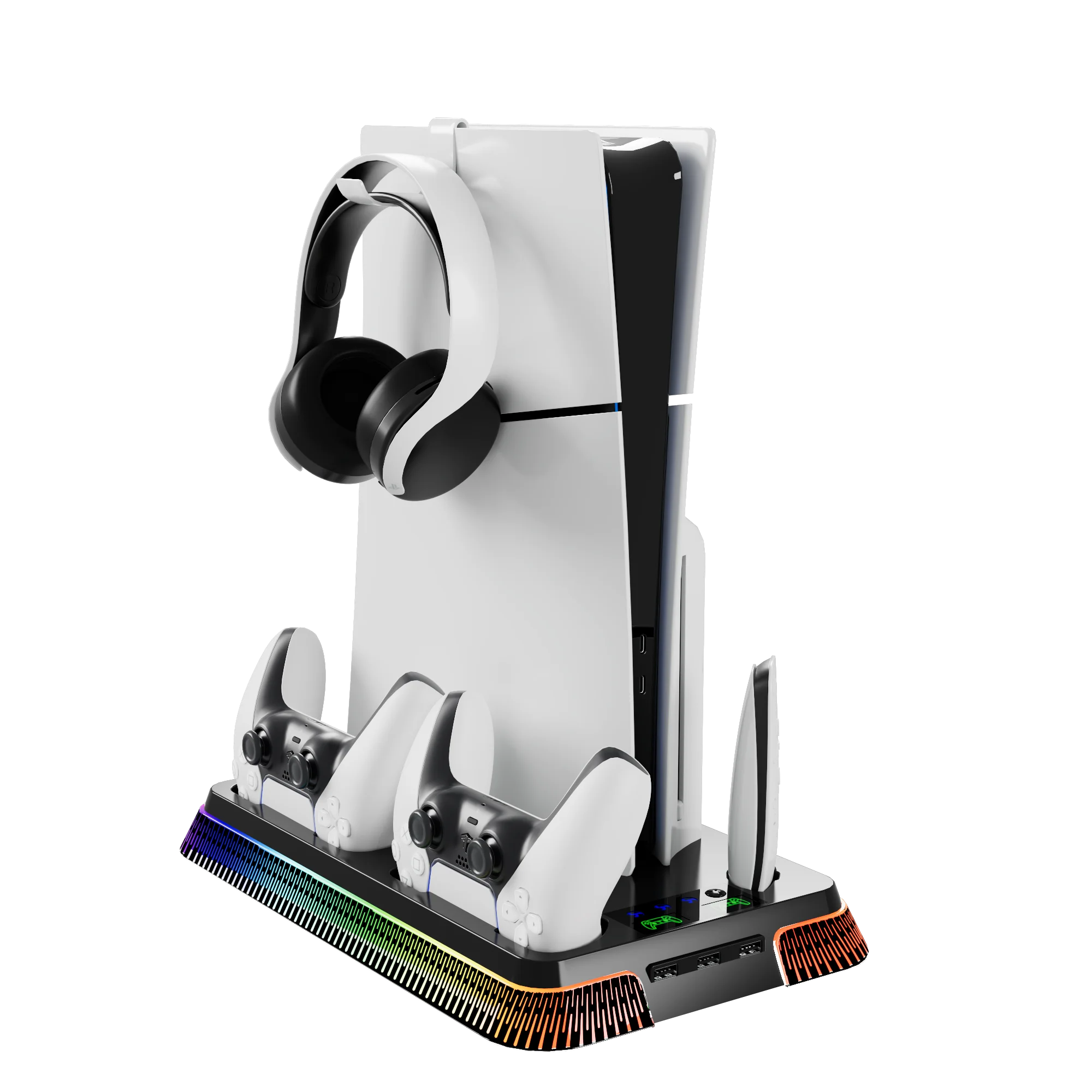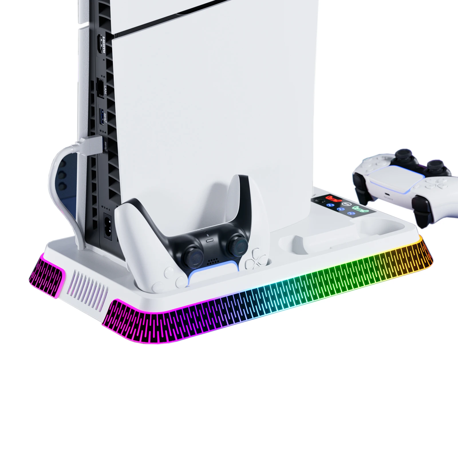 El artículo llegó al Reino Unido rápidamente y bien embalado. Perfecto para mi PS5 Slim digital únicamente. Simplemente se atornilla en la parte inferior de la consola, se conecta a un puerto USB de repuesto en la parte posterior y listo. Varios efectos de luz también y la capacidad de cargar el controlador en dos bases separadas. Muy feliz.