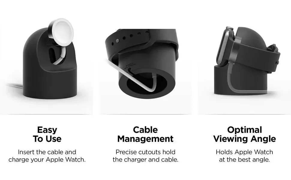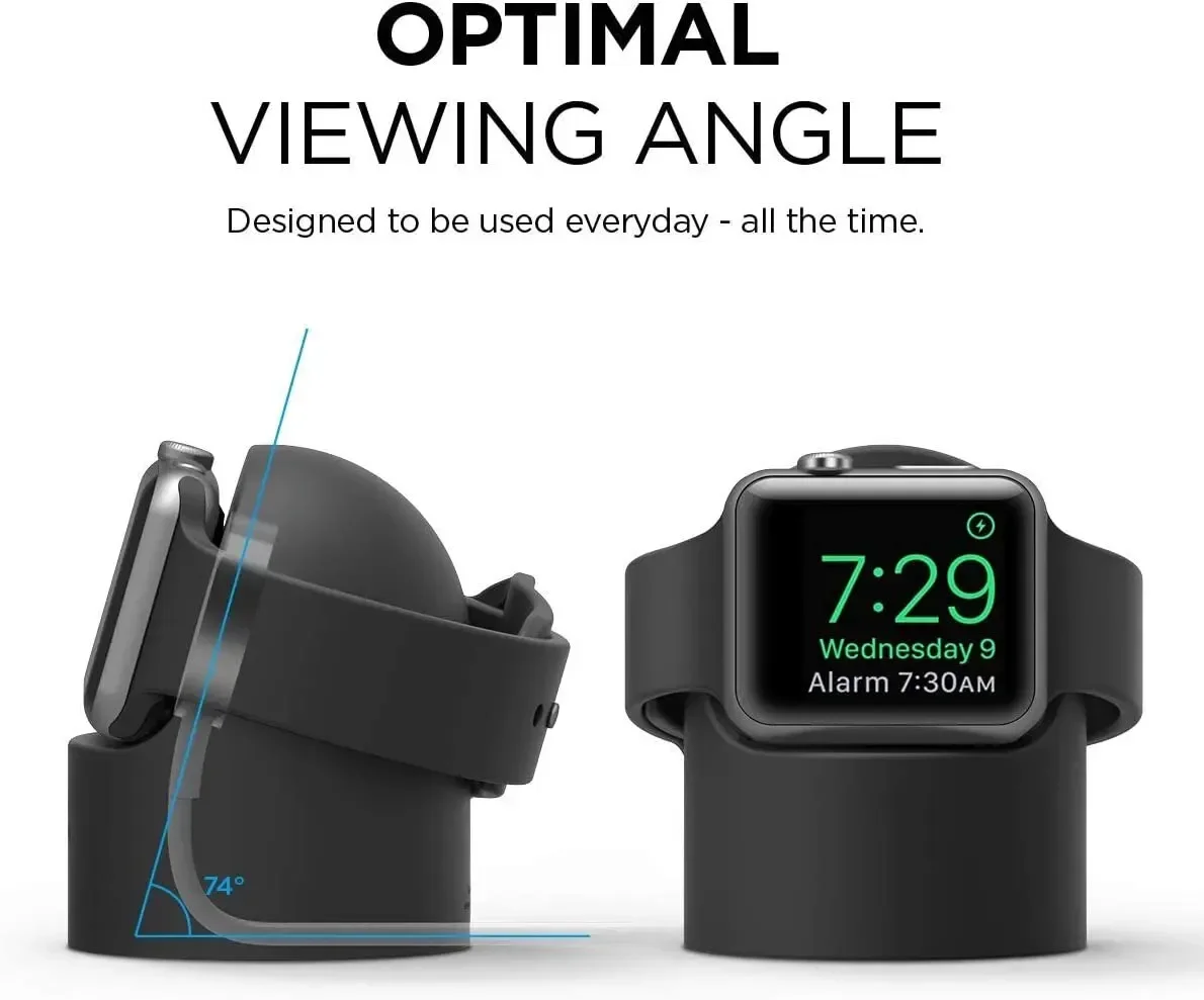 • Soporte de silicona para mayor estabilidad:El soporte de silicona proporciona soporte adicional para mantener su Apple Watch en su lugar de forma segura mientras se carga, evitando que se resbale o se caiga.