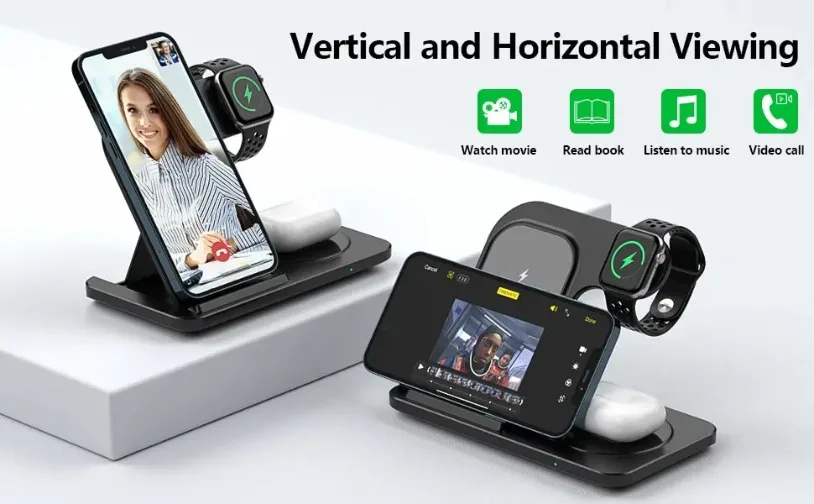 【Visualización vertical y horizontal】El diseño de acoplamiento de carga inalámbrica de 2 bobinas ofrece un rango de carga mucho más amplio vertical u horizontalmente para un uso ideal con Face ID.La estación de carga proporciona un ángulo cómodo para ver películas, leer, mirar la cara, etc. mientras se carga.El estuche de no más de 4 mm le permite cargar el teléfono y el iwatch sin quitarlo, lo que es más cómodo de usar. La almohadilla de silicona antideslizante de esta base de carga inalámbrica puede evitar que sus dispositivos se rayen y se deslicen.
