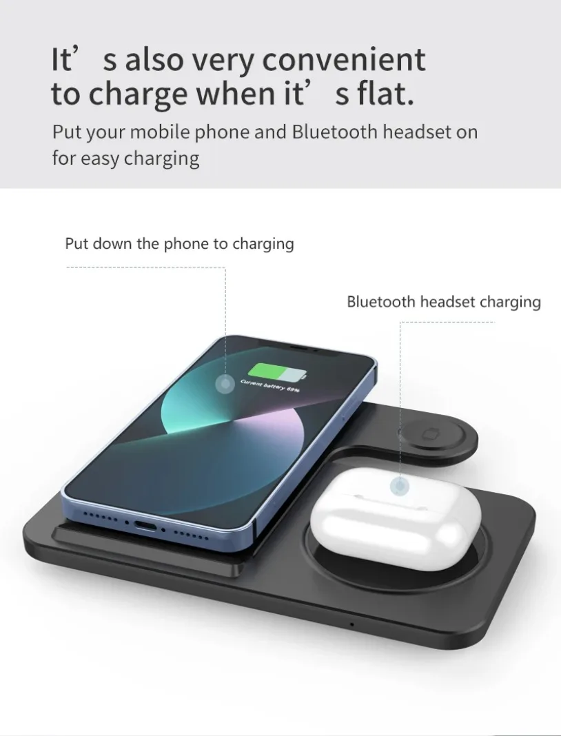 • Almohadilla de soporte para cargador inalámbrico 3 en 1:Cargue varios dispositivos a la vez con esta almohadilla de soporte para cargador inalámbrico 3 en 1.