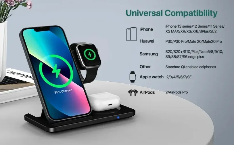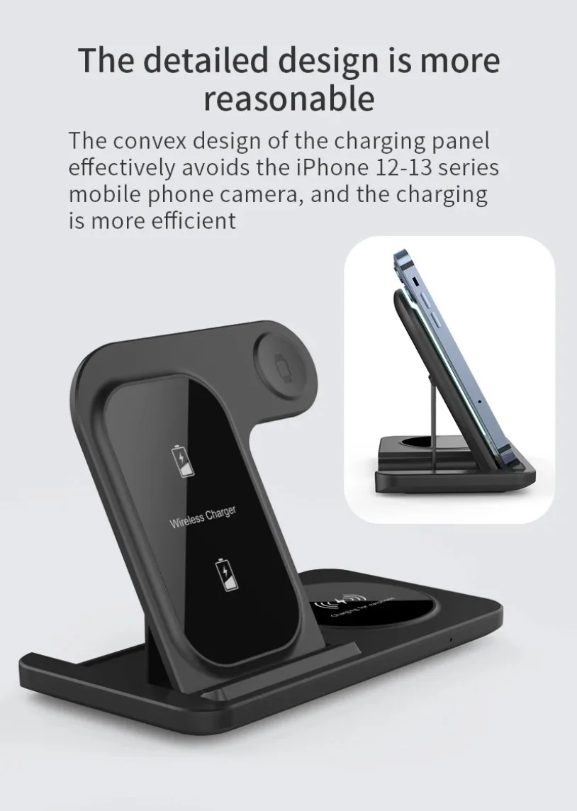 【Estación de carga 3 en 1 mejorada】Nuestro cargador inalámbrico rápido está especialmente diseñado para resolver el problema de la carga lenta del iPhone 13Pro gracias a la gran cámara.También puede cargar su iPhone, iWatch y airpods al mismo tiempo.Ya no necesita todo tipo de cables de carga desordenados, lo que hace que su escritorio luzca más simple y ordenado.